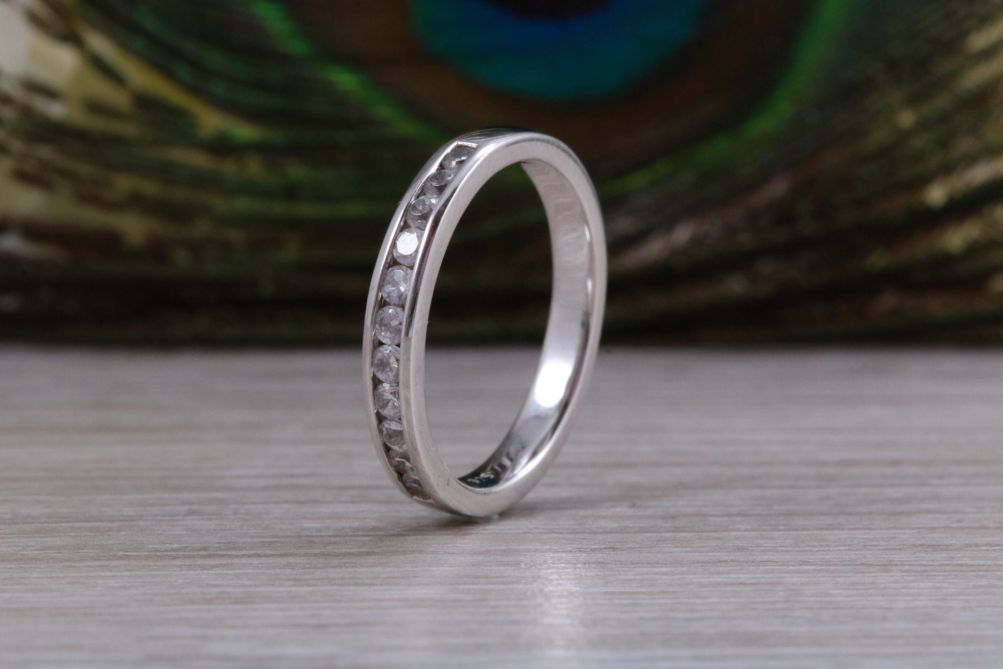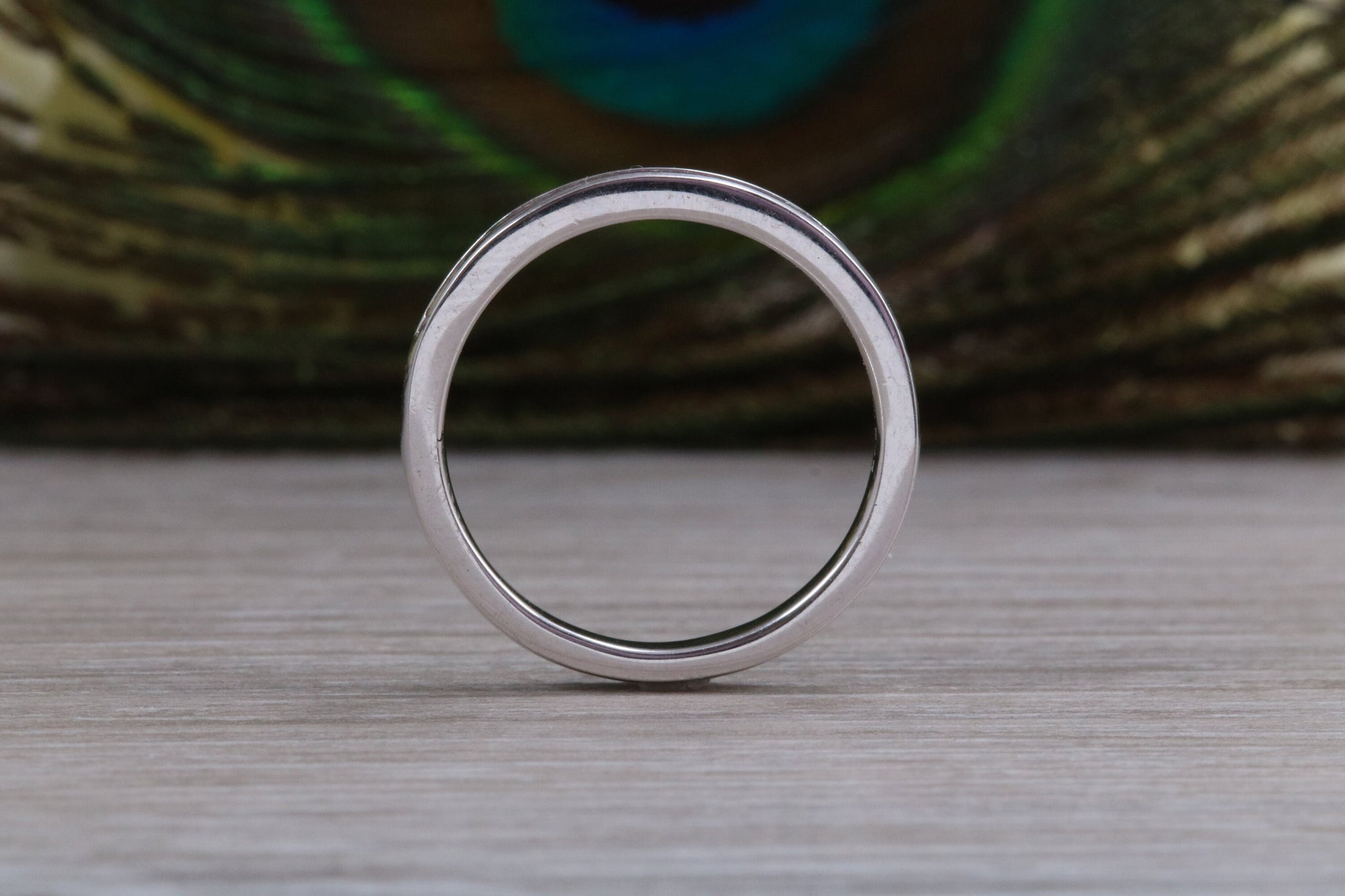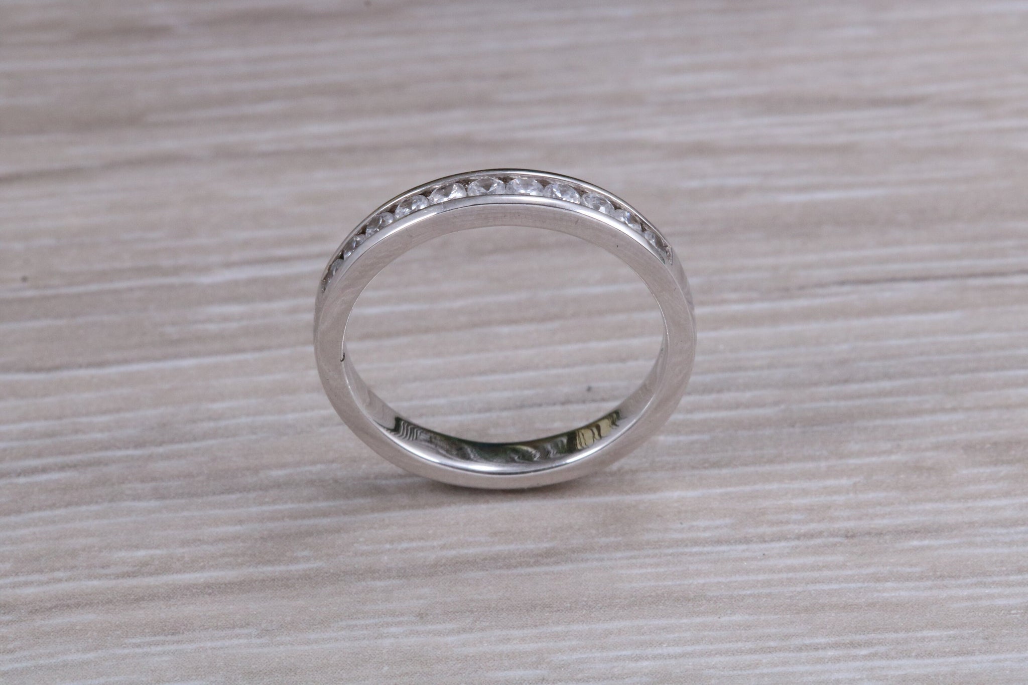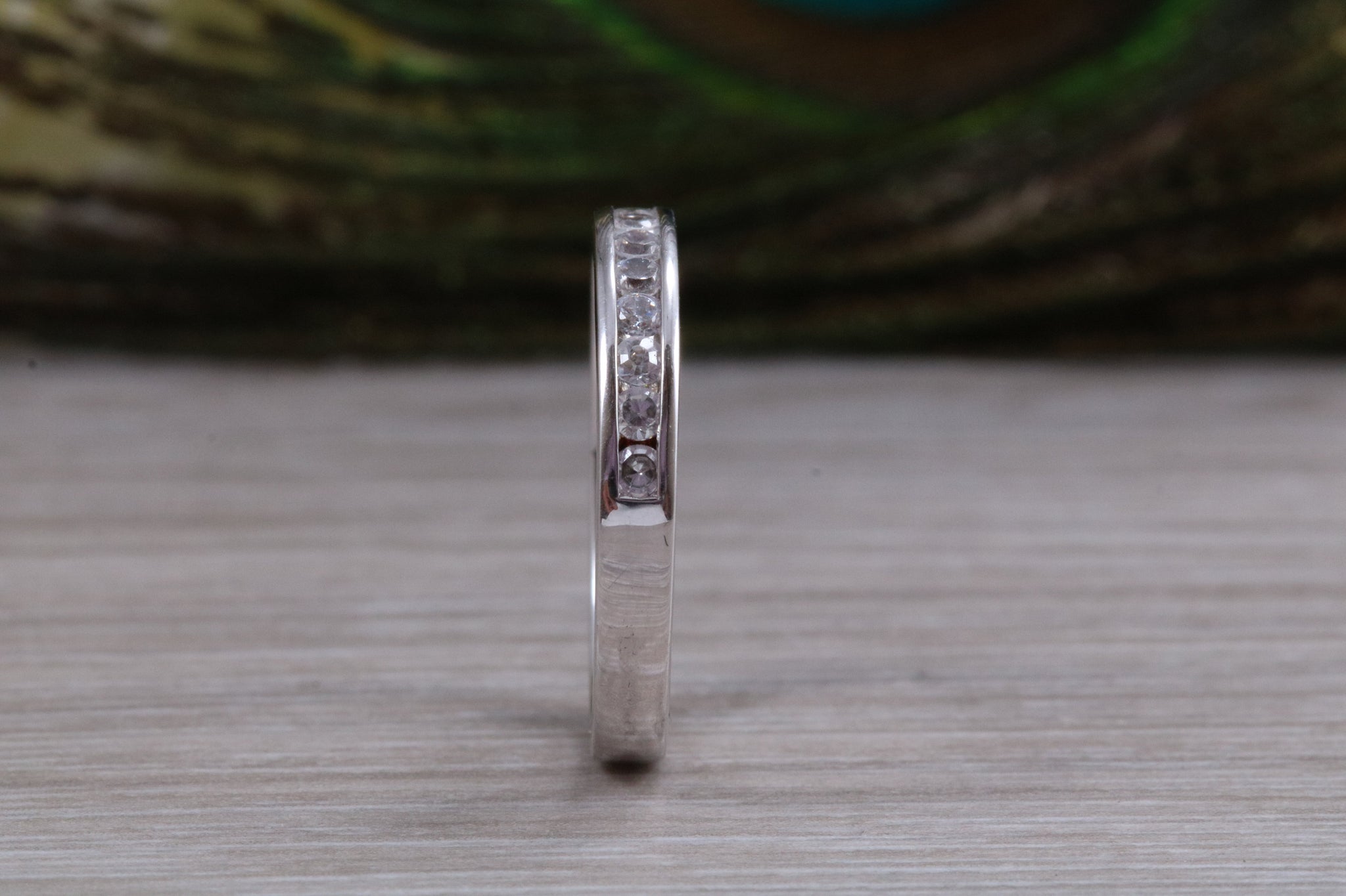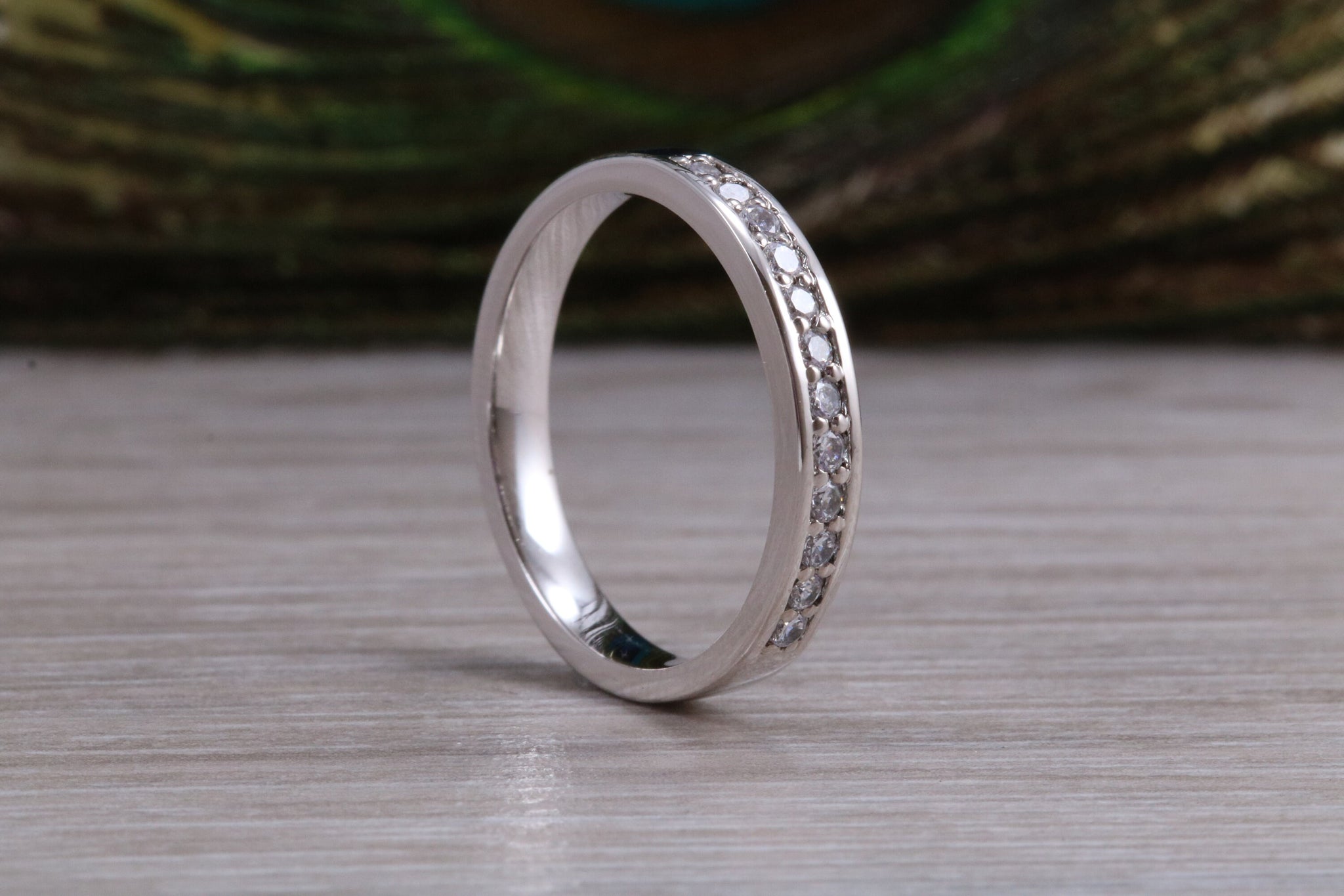 Flat profile band measuring 3.00 mm wide with channel set diamonds