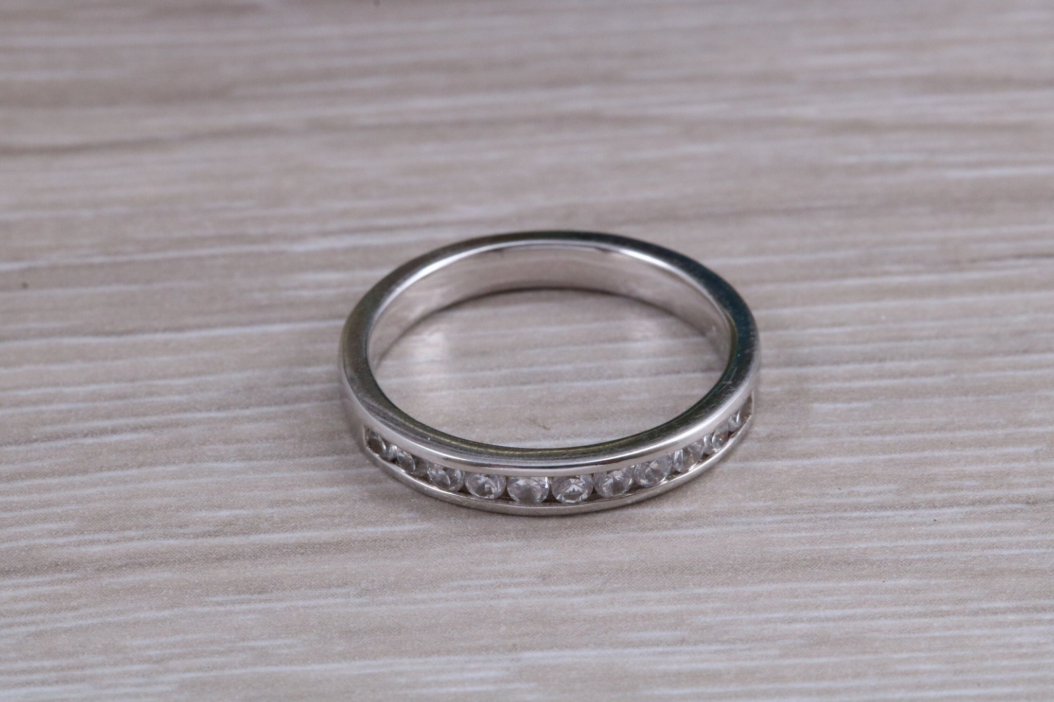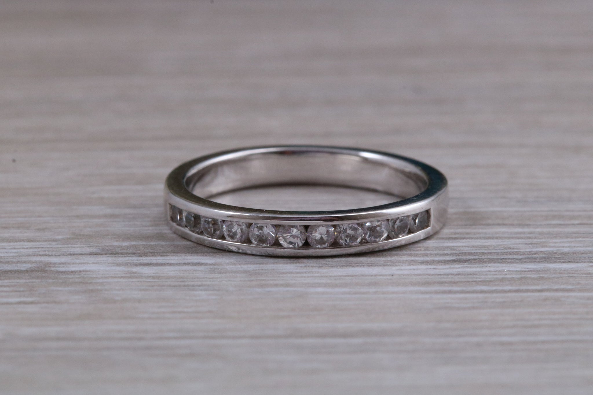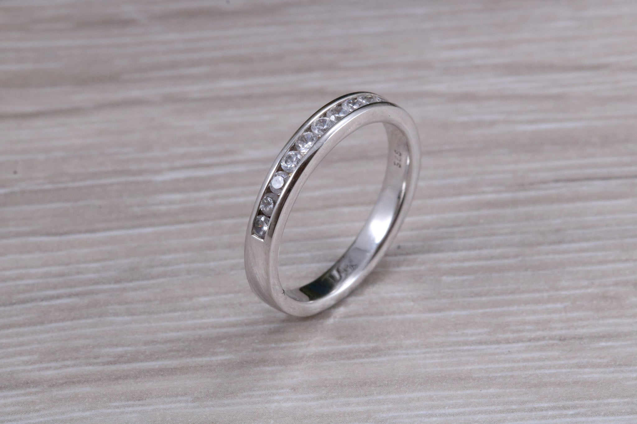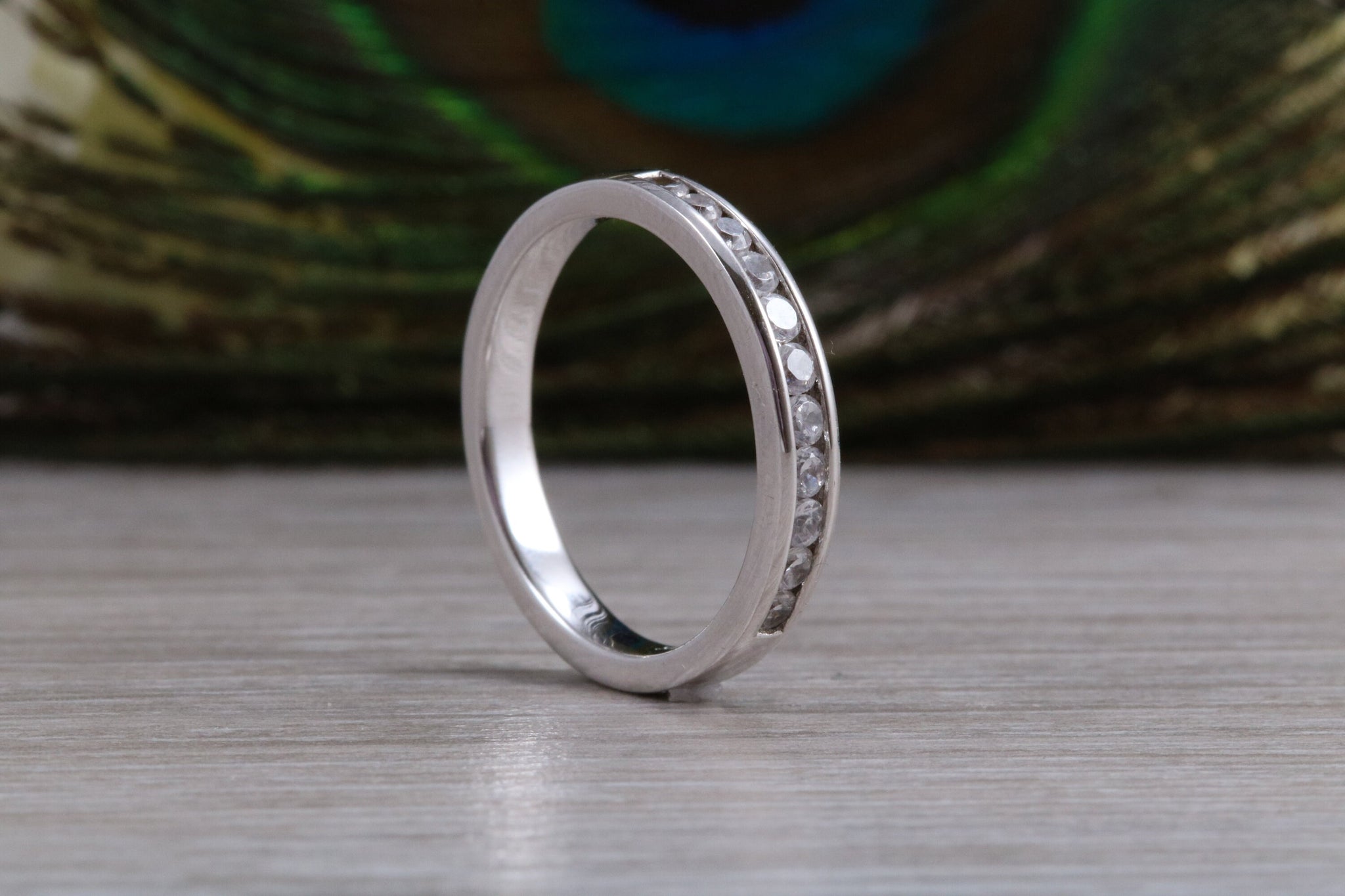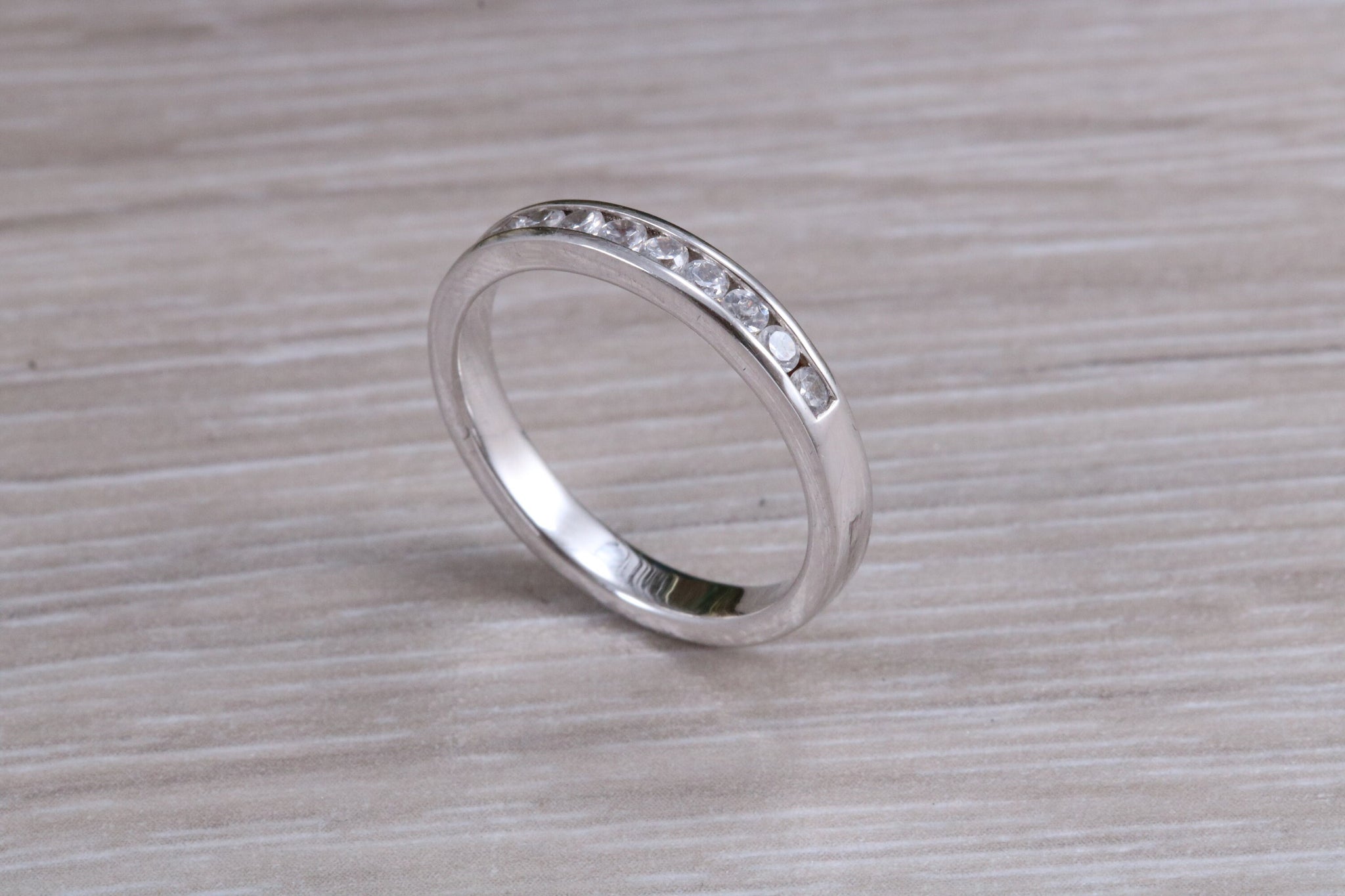 Flat profile band measuring 3.00 mm wide with channel set diamonds