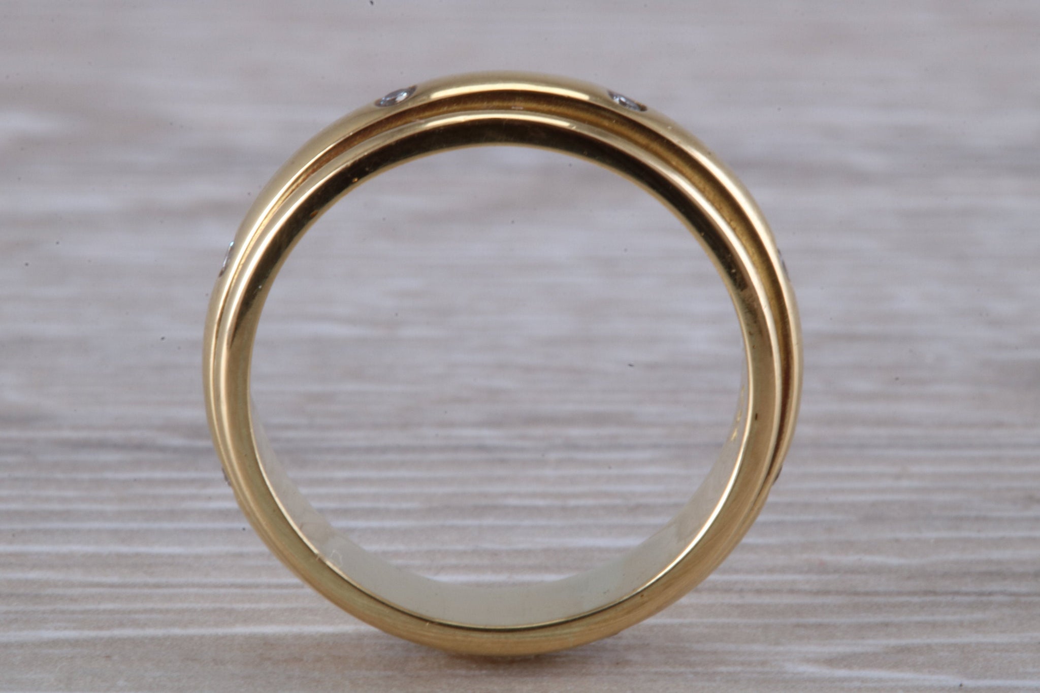 Set with seven round brilliant cut diamonds equaly spaced out all around the ring and of F VS1 grade and total weight of diamonds is 0.07 carat