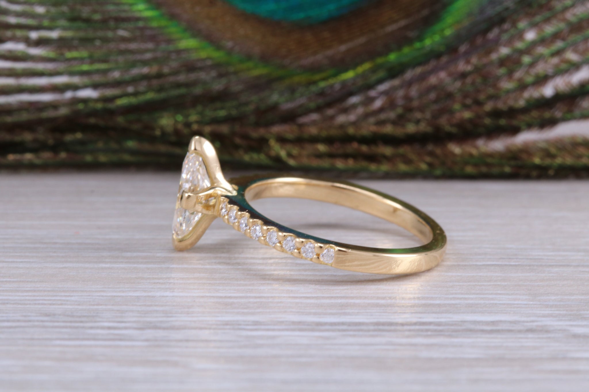 Natural Marquise Cut Diamond weigh's 0.50 carat and top grade of F Colour and VS 2 Clarity with a certificate and further complemented with 0.15 carats of round cut diamonds to the sides all put together in this minimalist style 18ct yellow gold ring