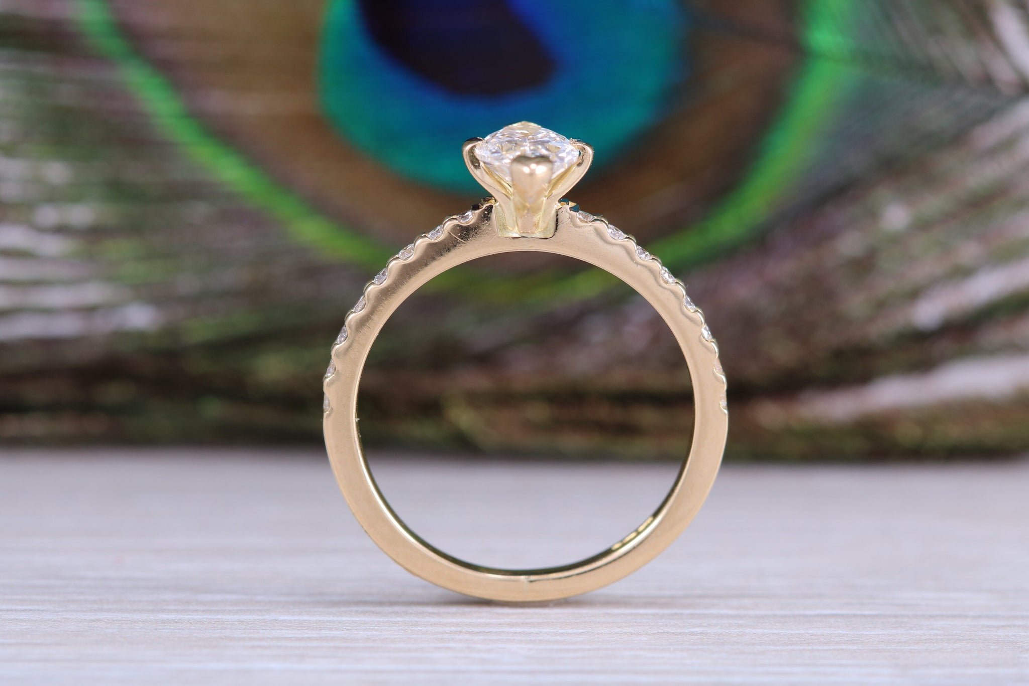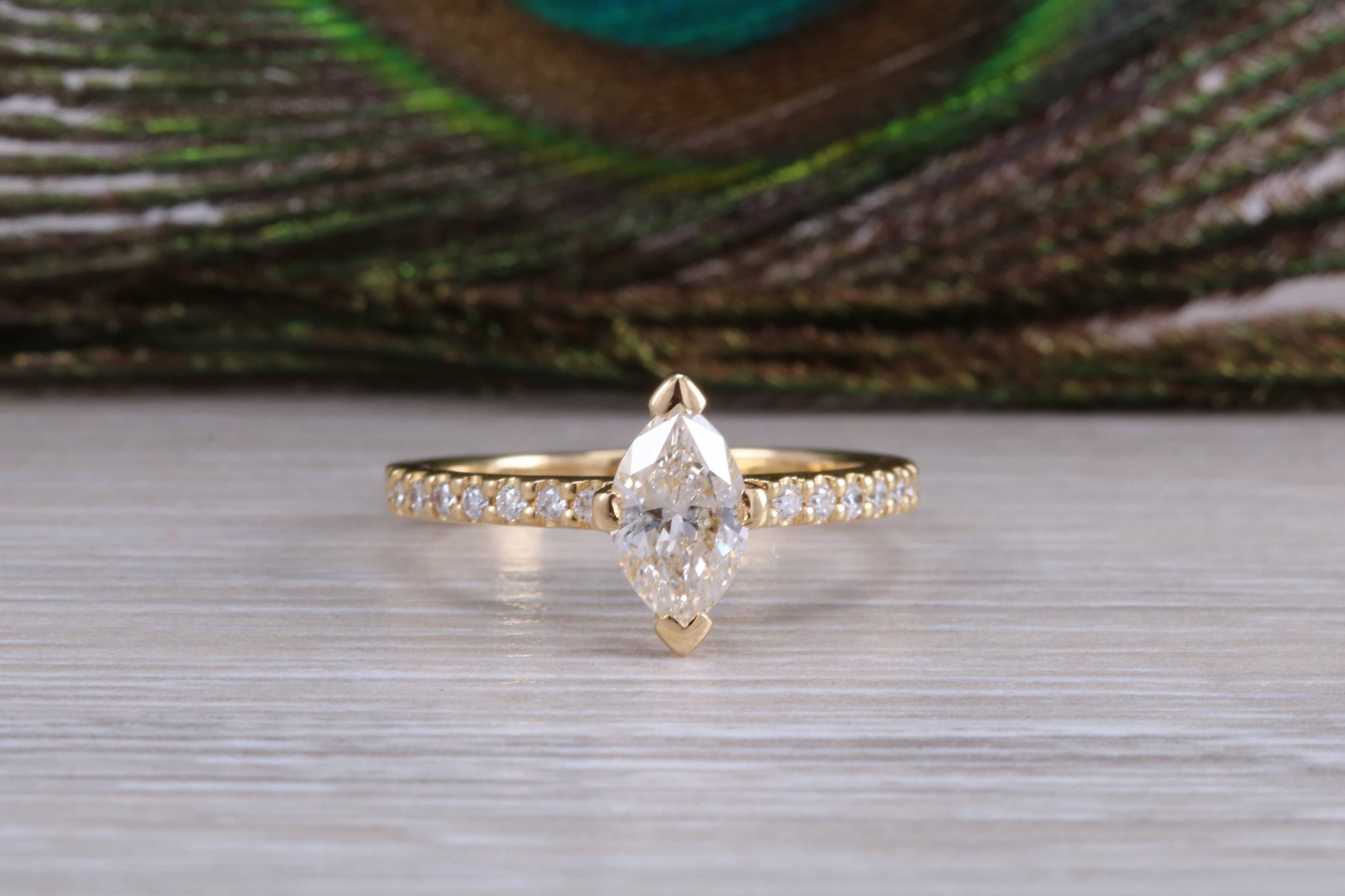 This beautiful 18ct yellow gold Ring is set with a top grade Marquise cut Natural Diamond to the centre and further complemented by natural round cut diamonds to the sides