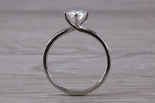 This simple, elegant and timeless design platinum solitaire is set with a 6.50 mm round brilliant cut Moissanite