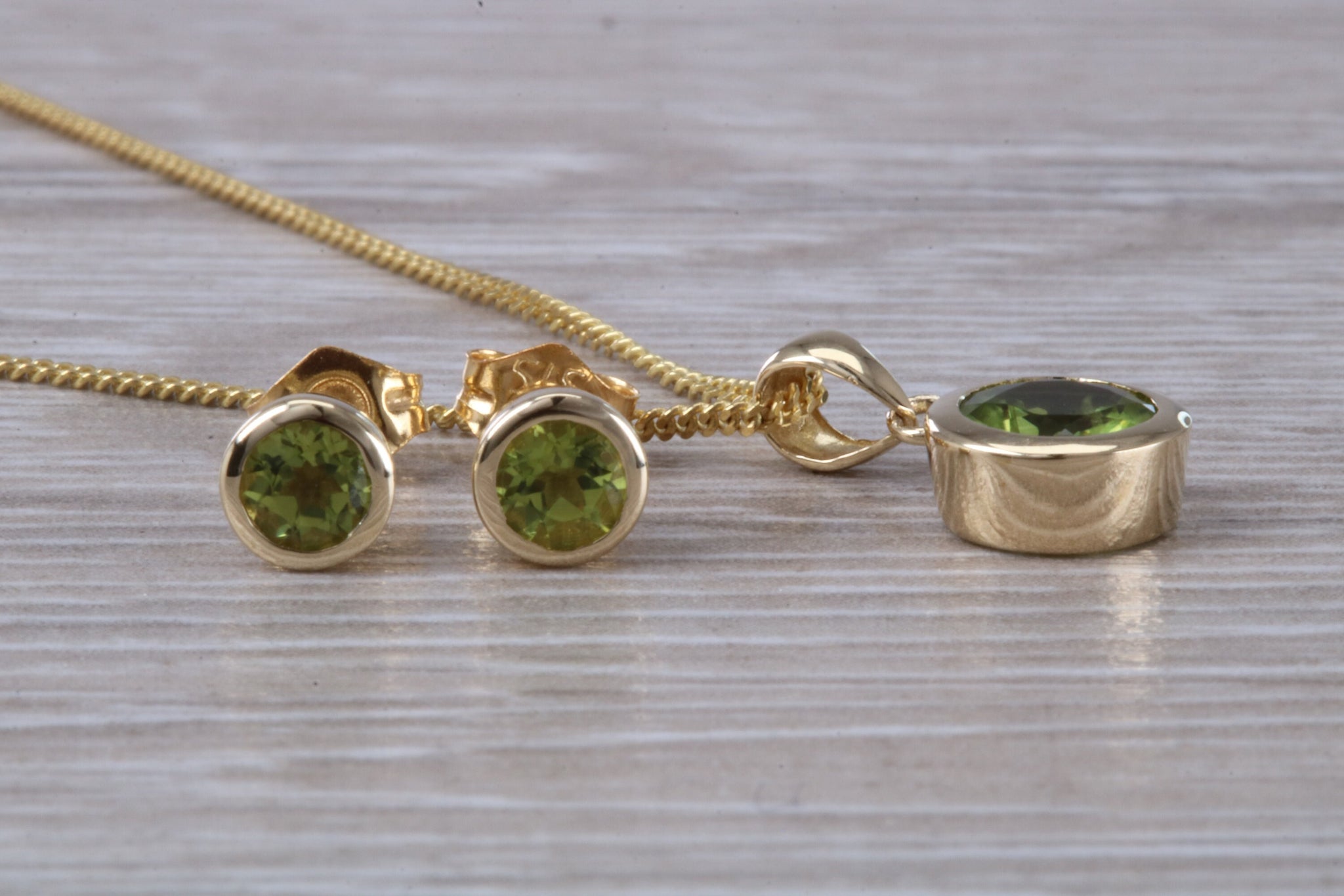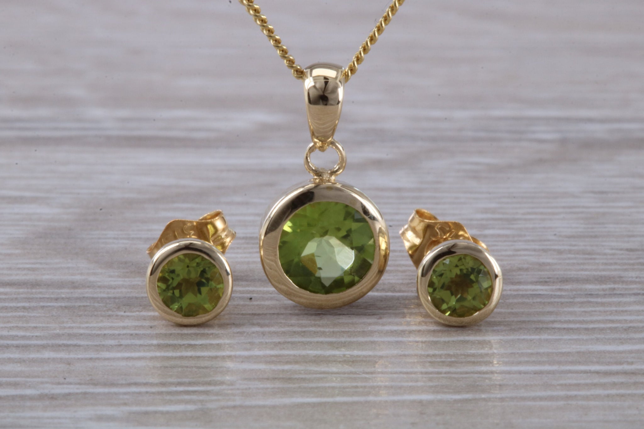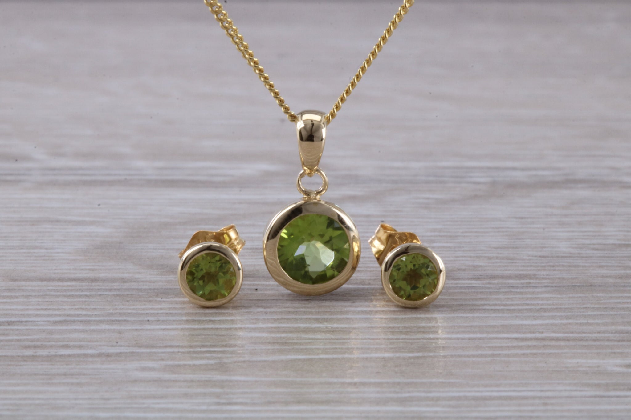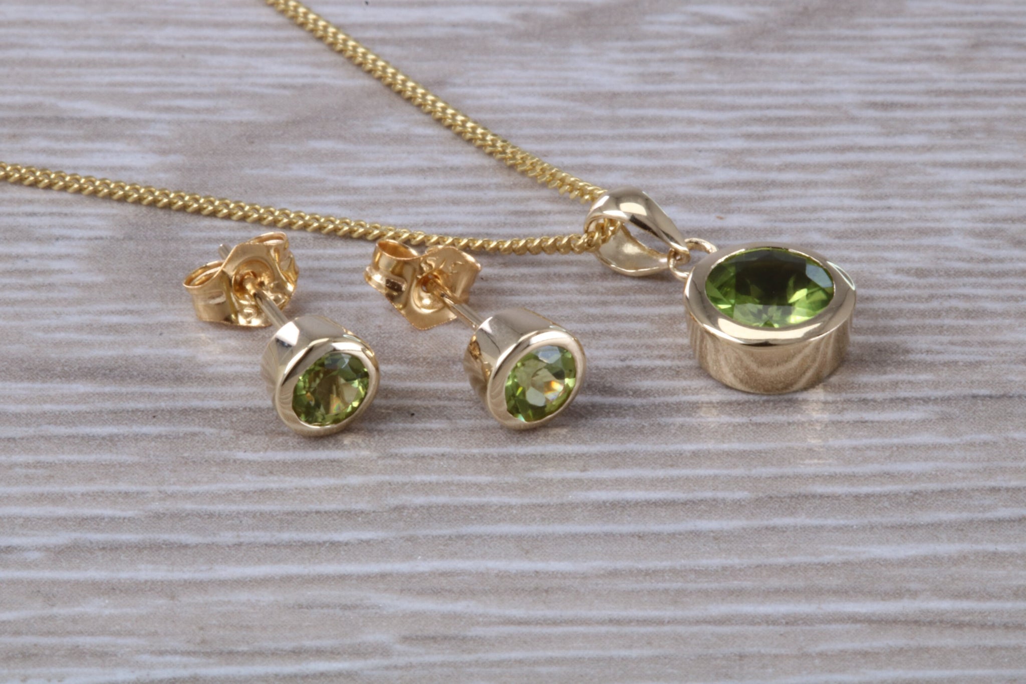 Round cut Peridot Earrings and Matching Necklace set in Yellow Gold