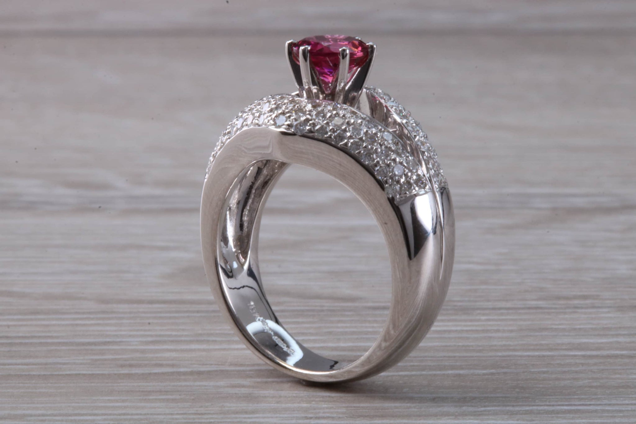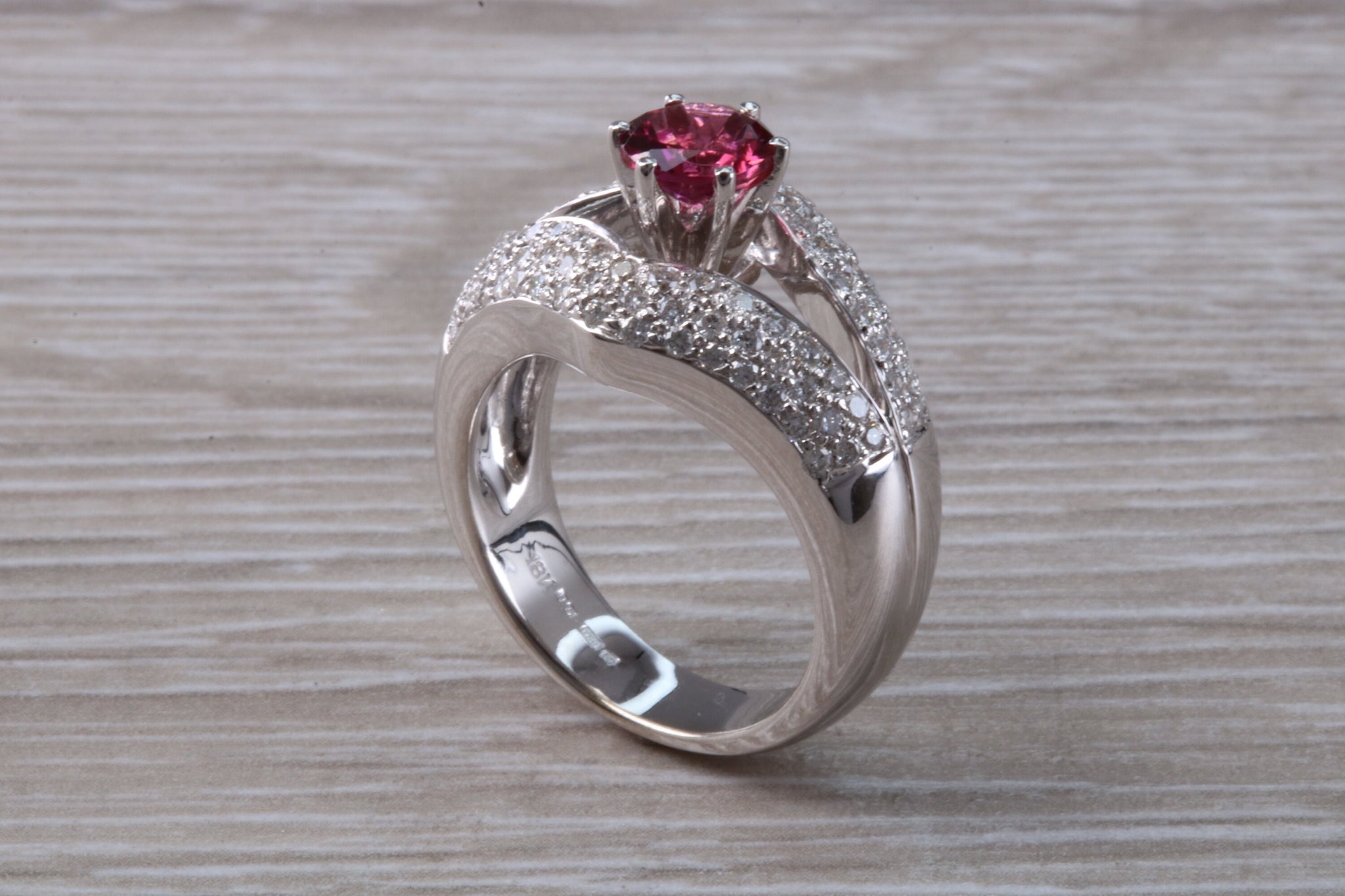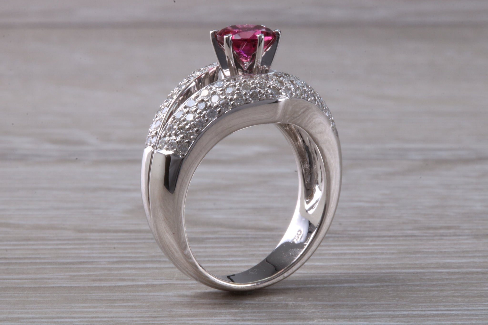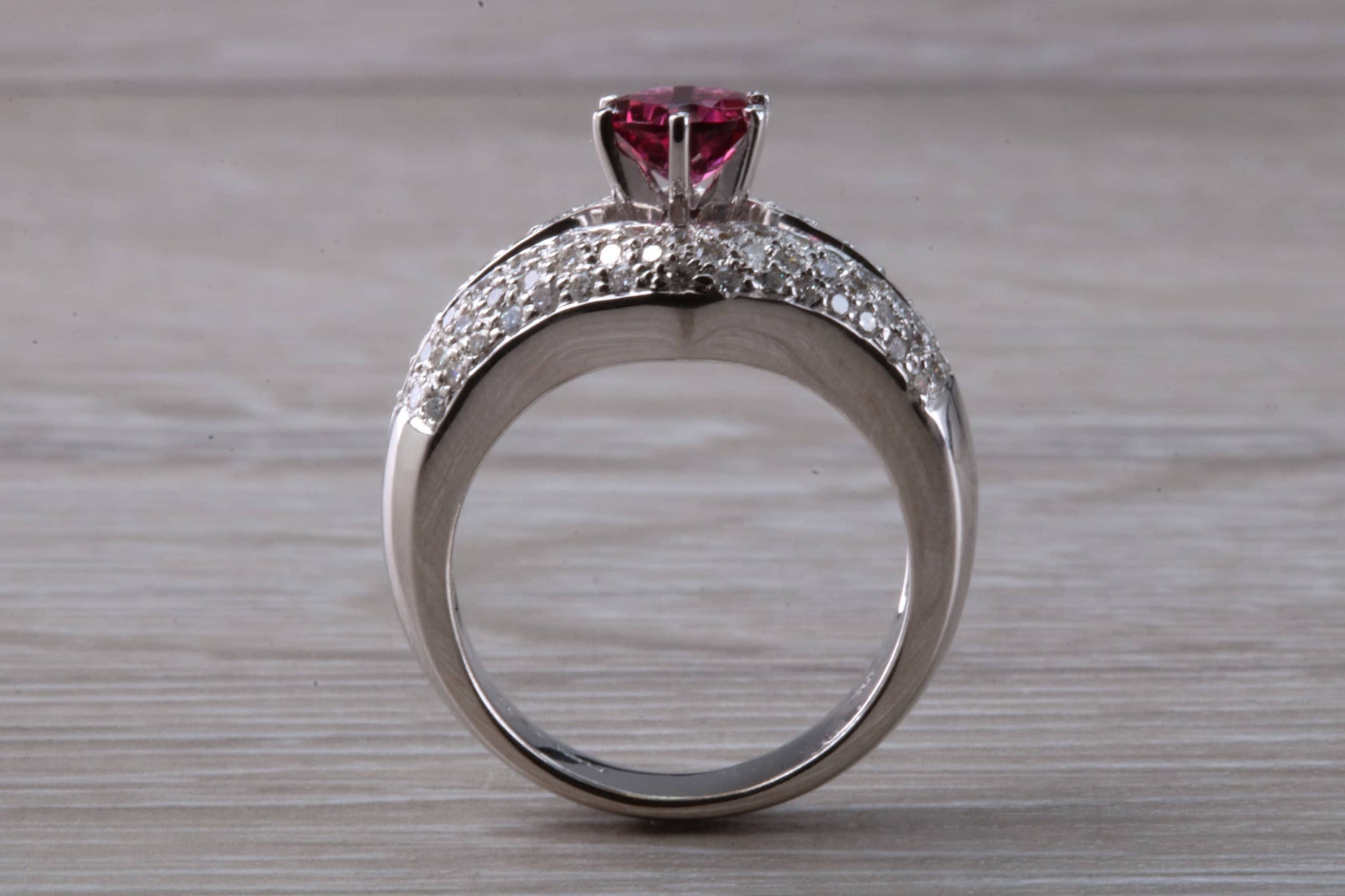 Ladies 18ct white gold ring set with top grade natural Pink Tourmaline and Top Grade round brilliant cut Diamonds