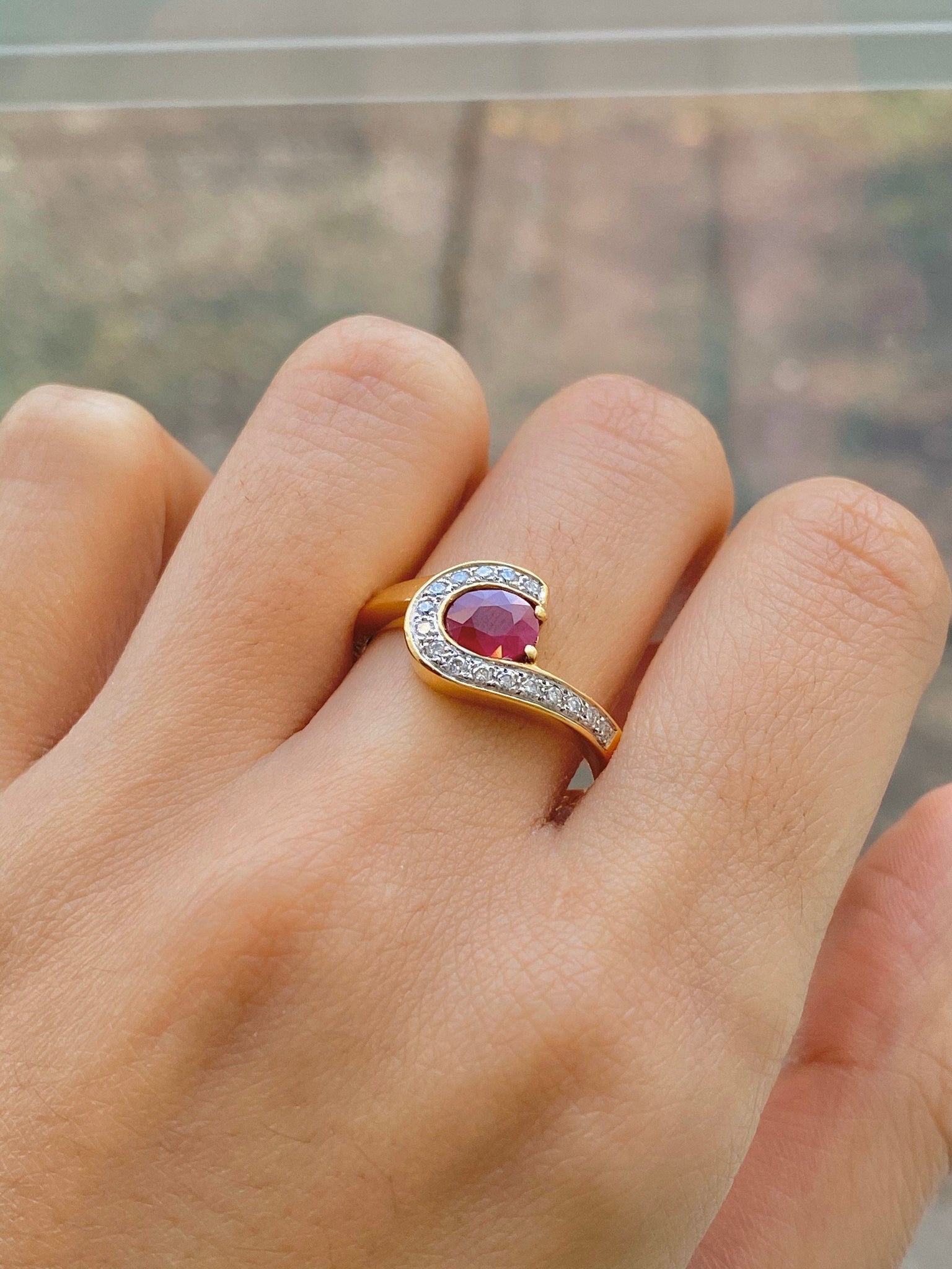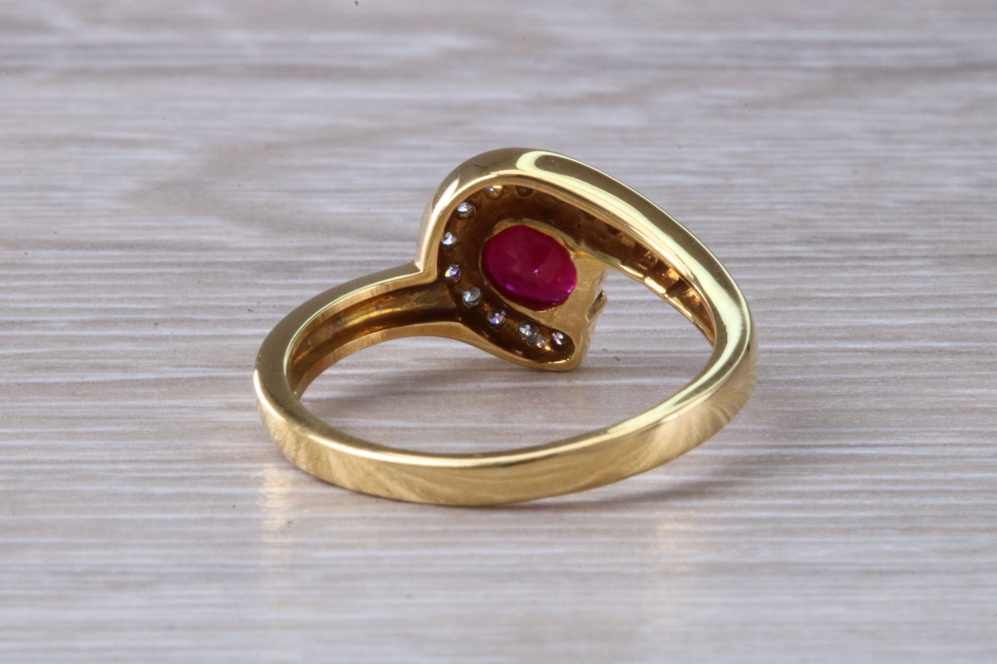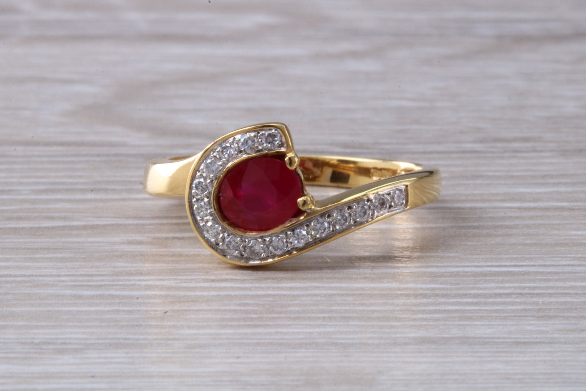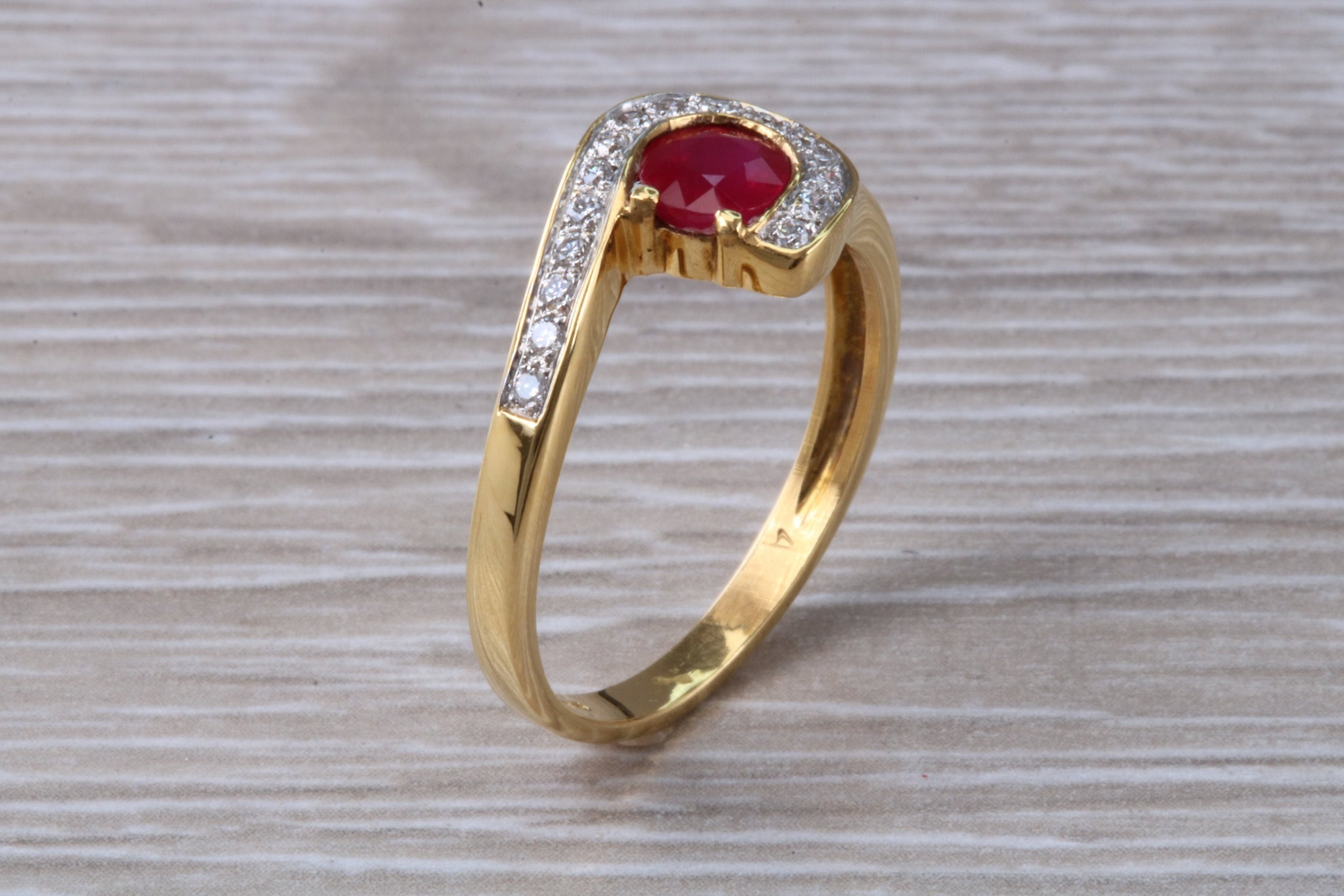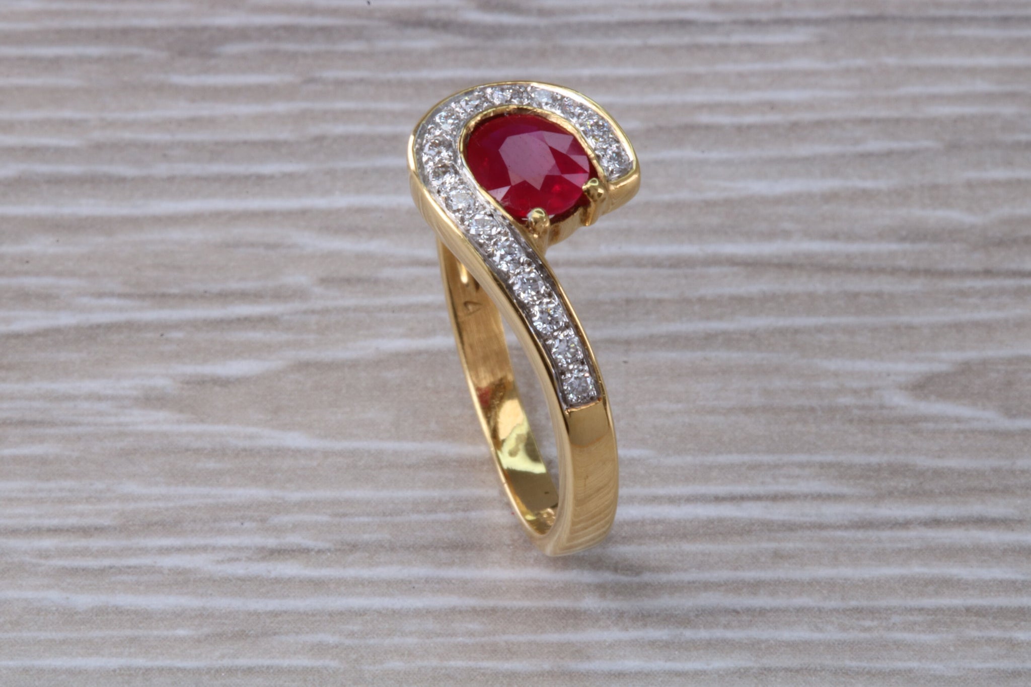 How different and unusual is this piece of jewellery, simple yet elegant and dressy ring set with oval cut Ruby and complimented with top grade Diamonds all put together in this very rich 18ct yellow gold setting