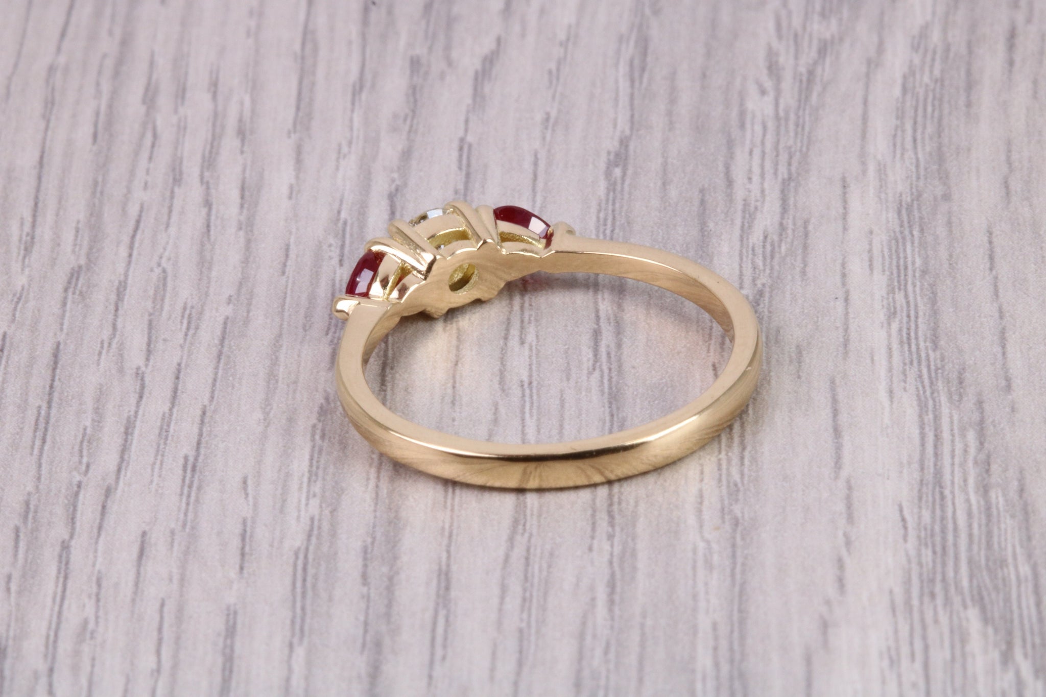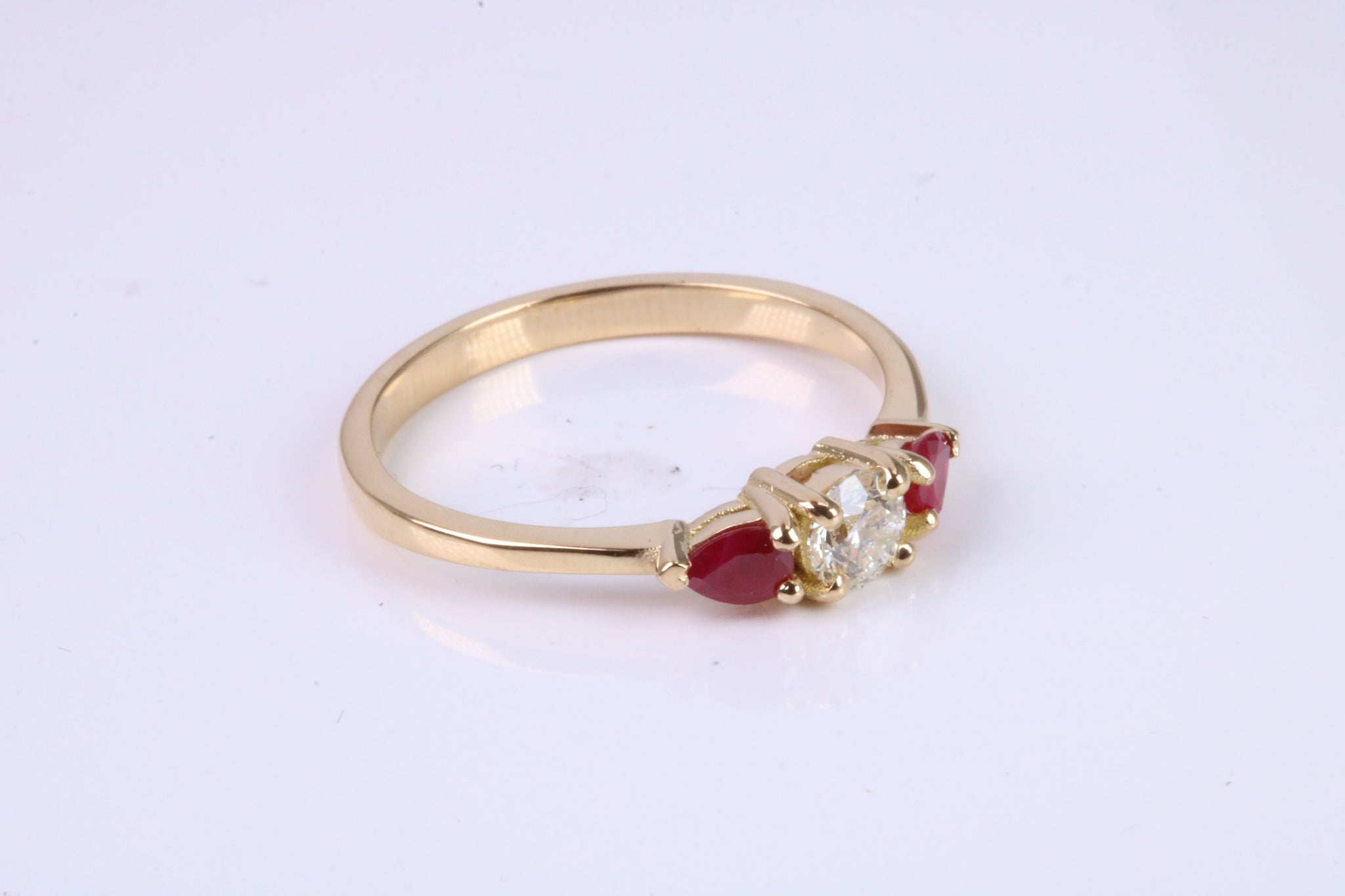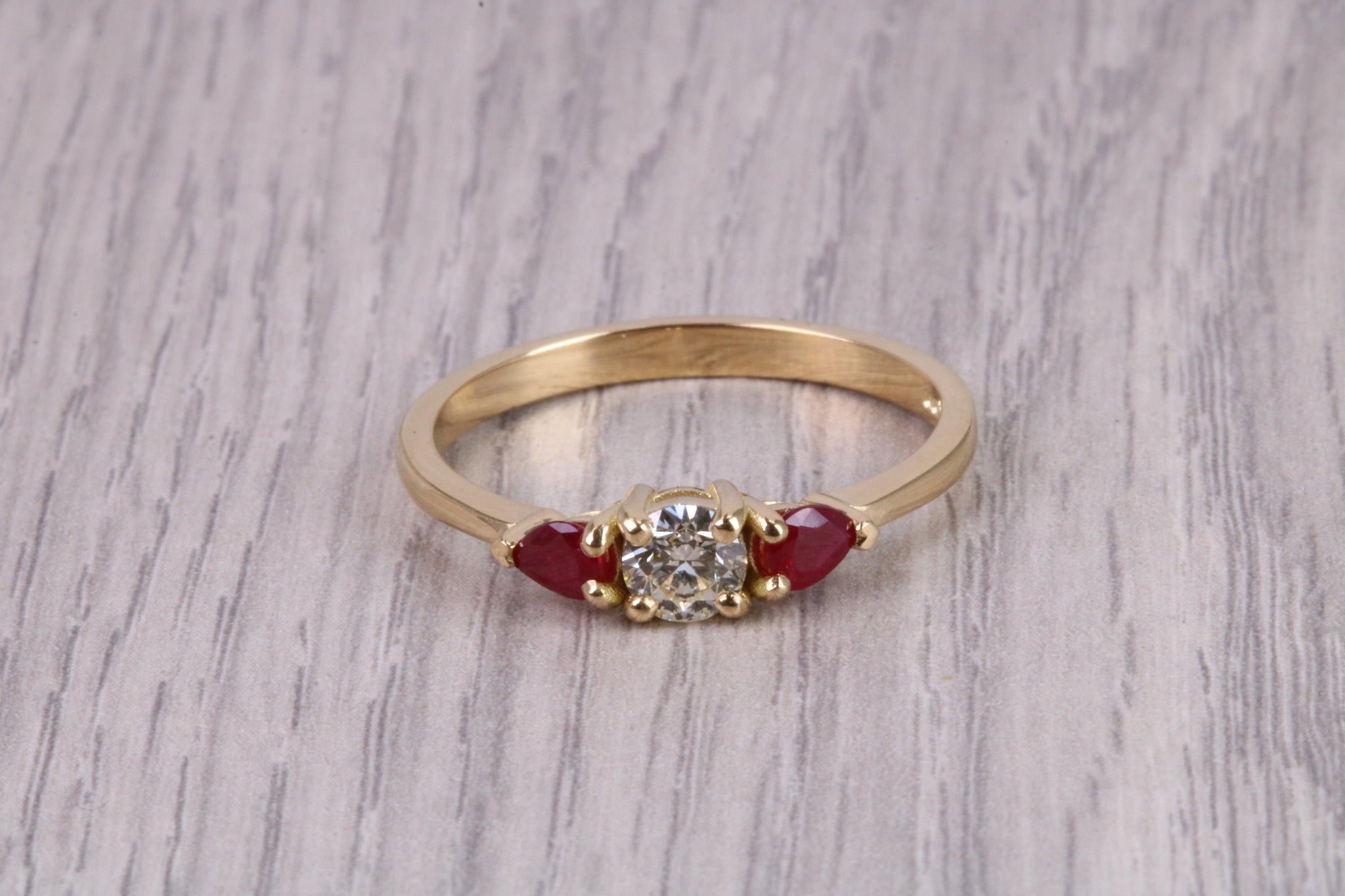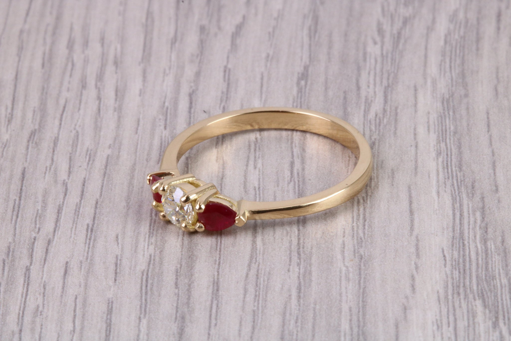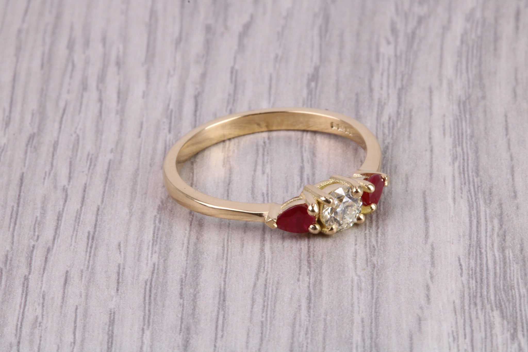Set with round brilliant cut Diamond to the centre and perfectly complimented with tear drop cut Ruby on either side