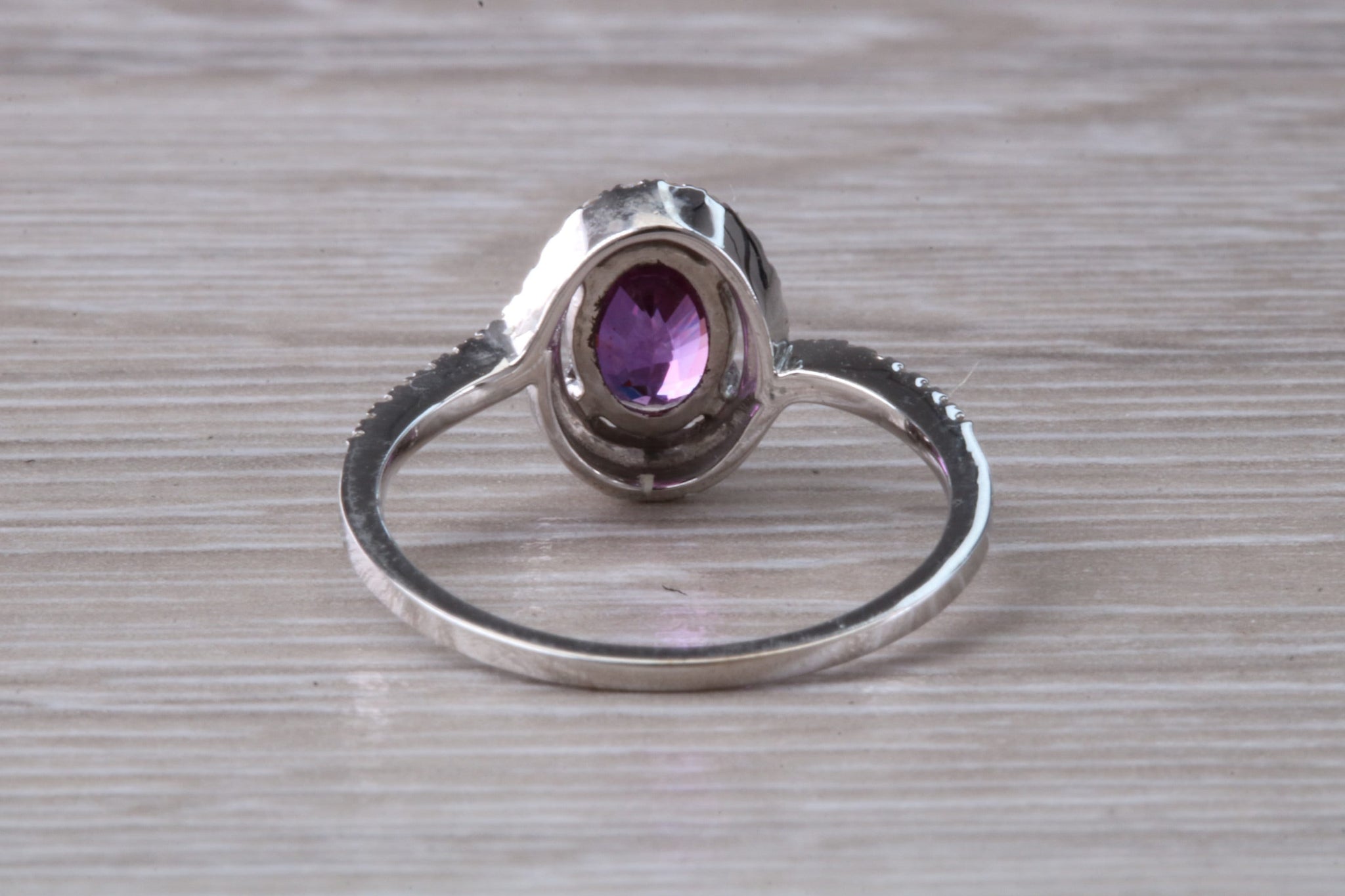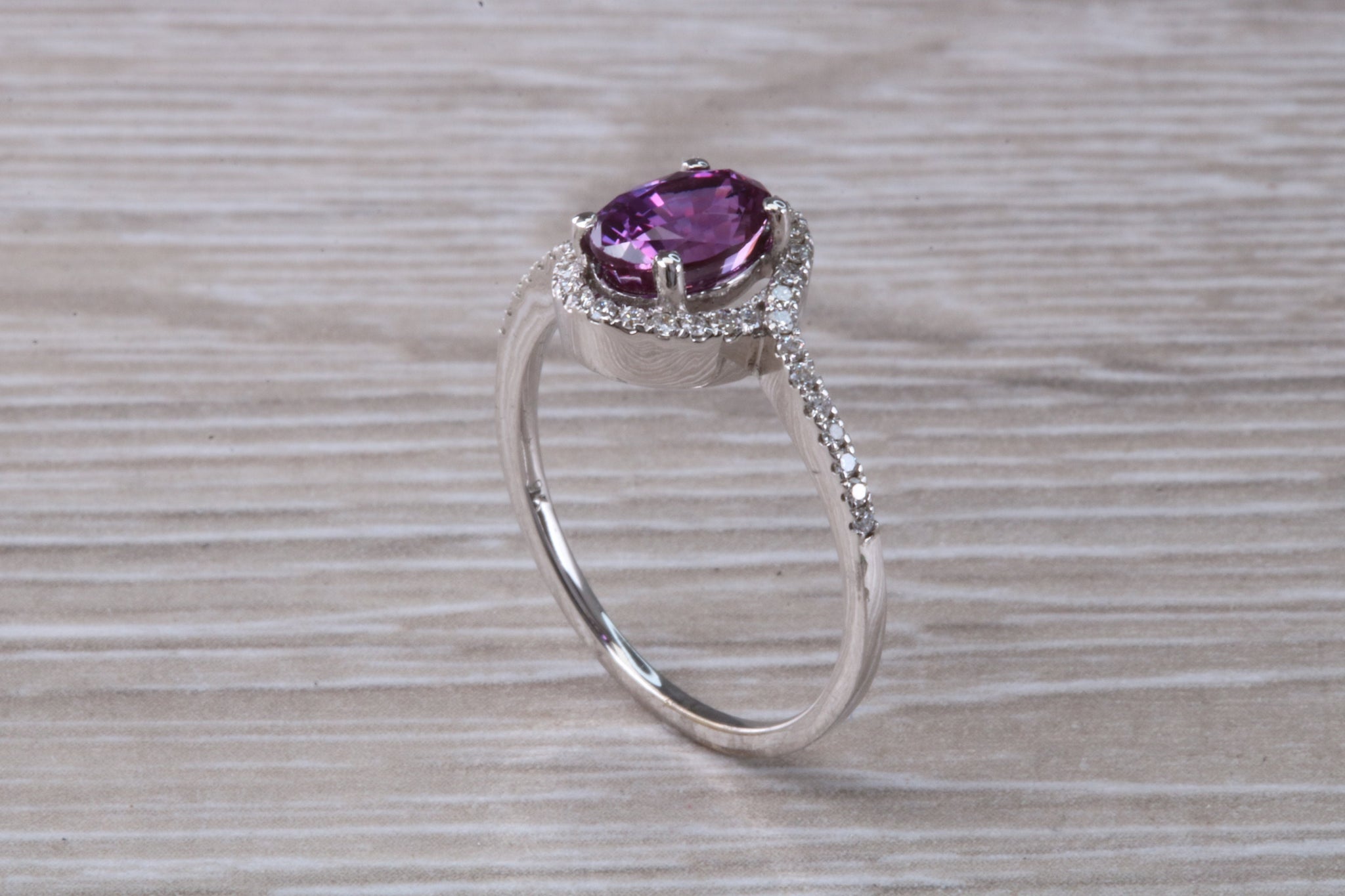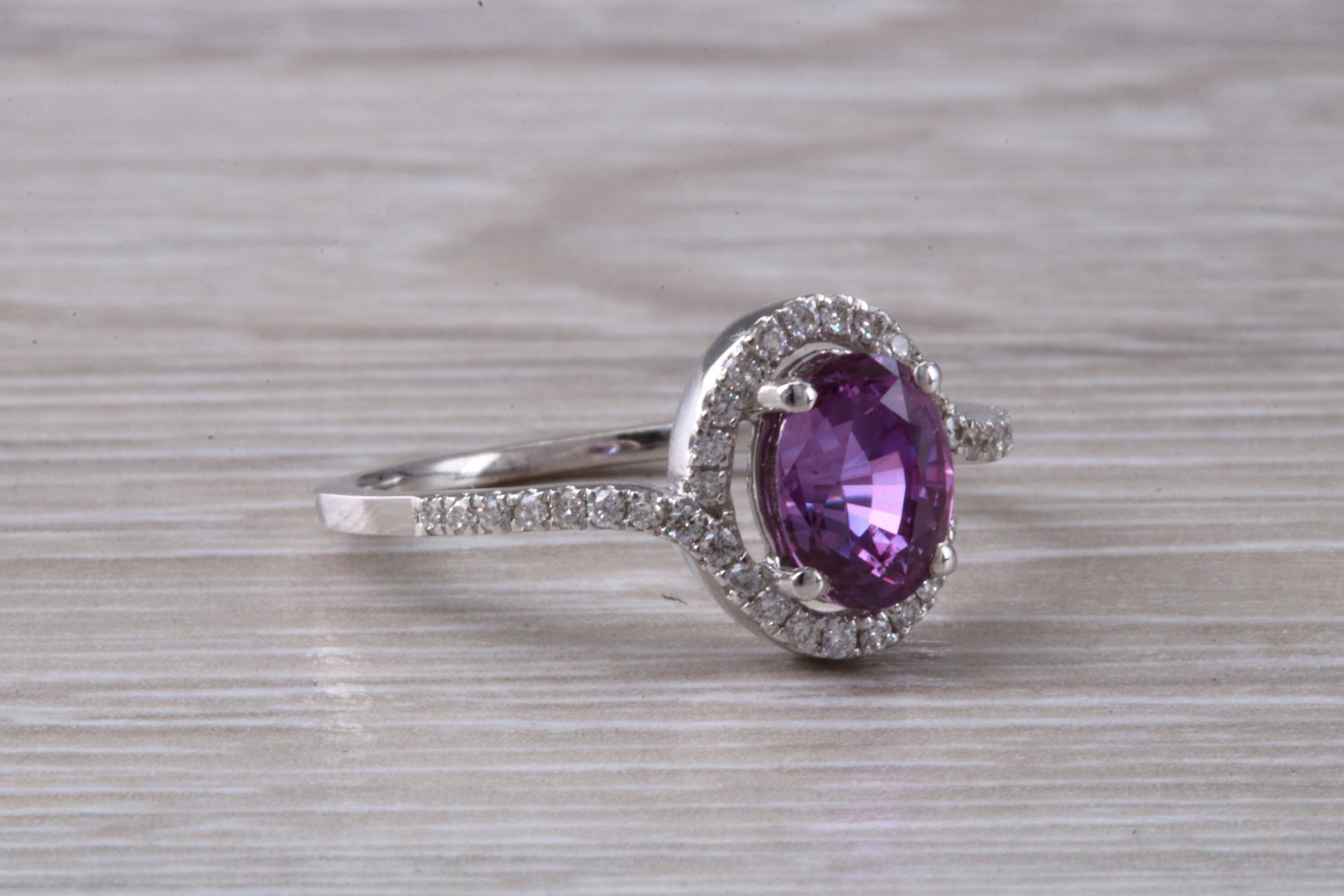 9ct white gold ring, beautiful Pink Sapphire surrounded by top grade round Diamond's and further set with top grade white Diamonds to the twist shank ring