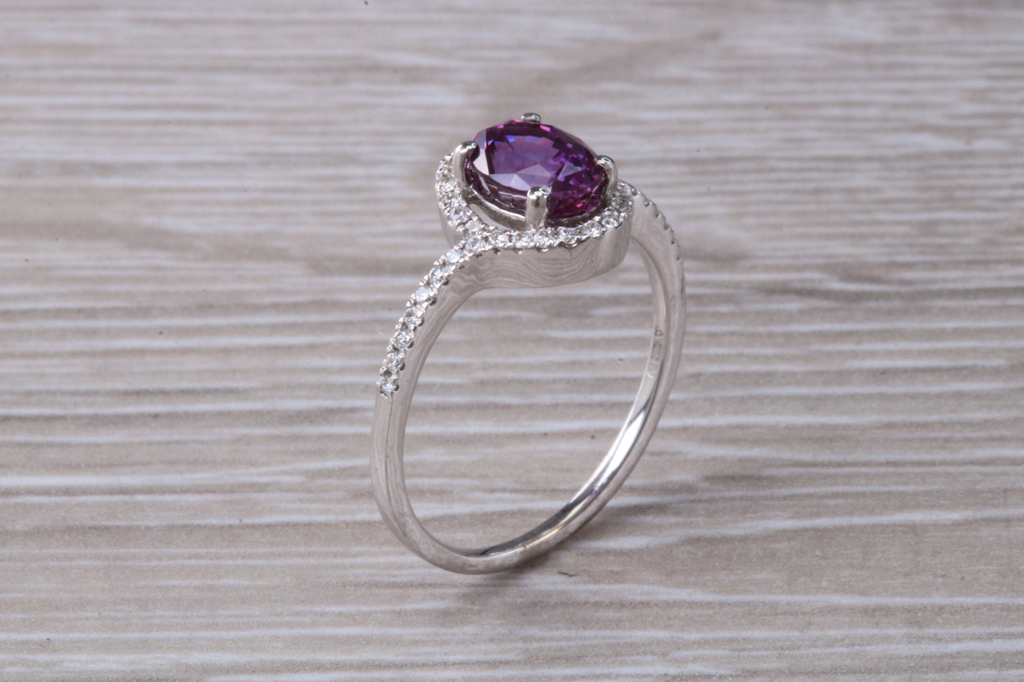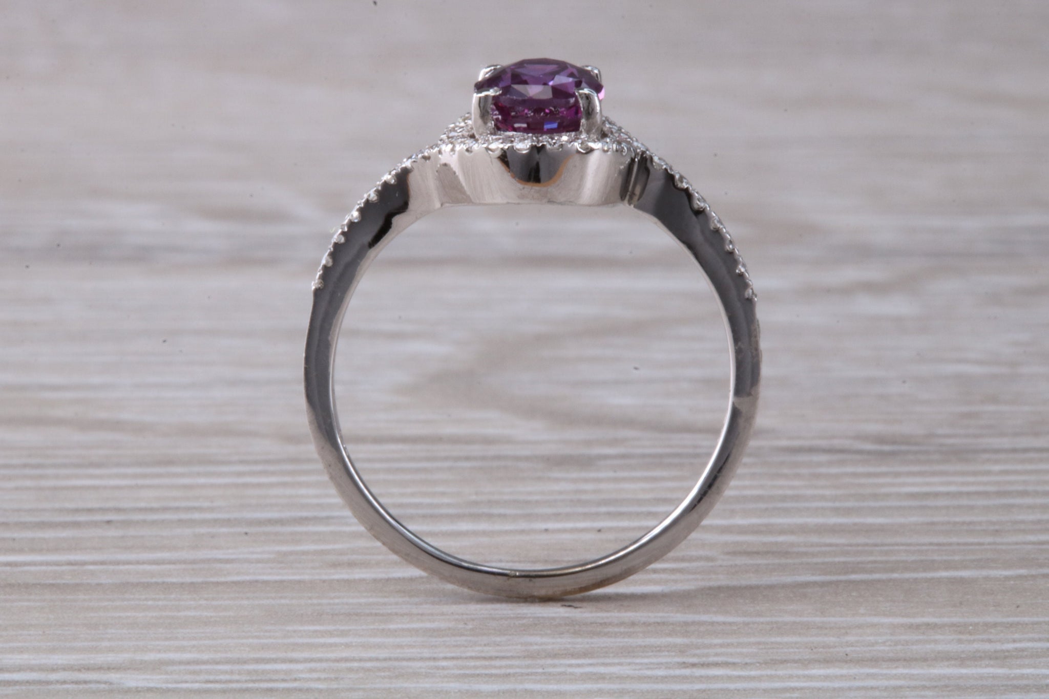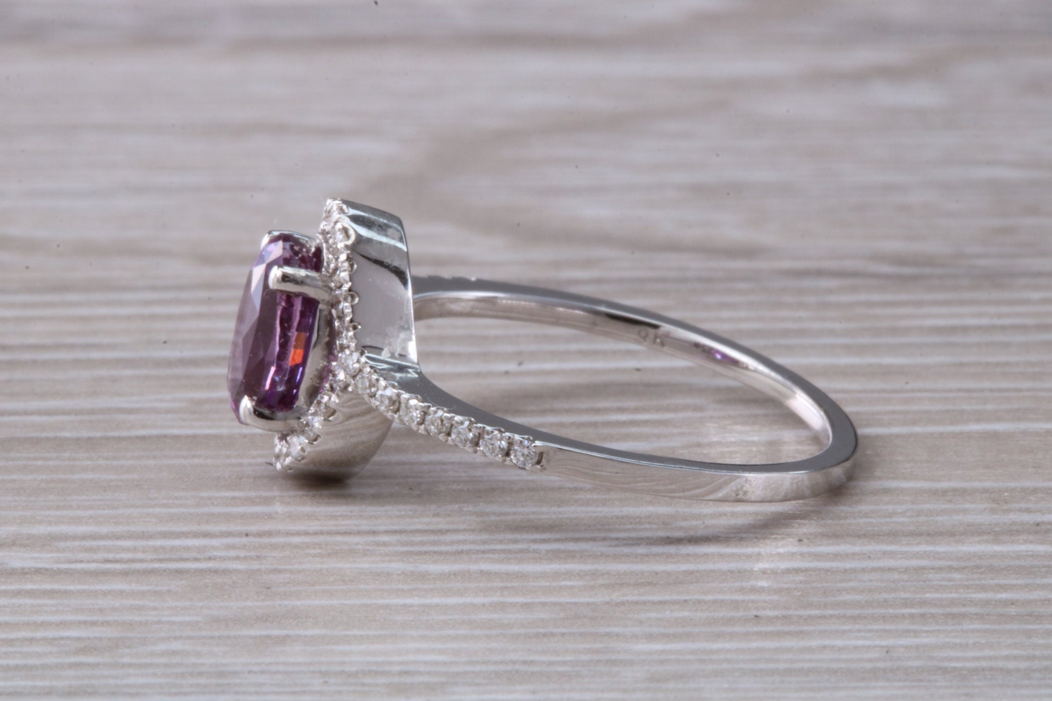 9ct white gold ring, beautiful Pink Sapphire surrounded by top grade round Diamond's and further set with top grade white Diamonds to the twist shank ring