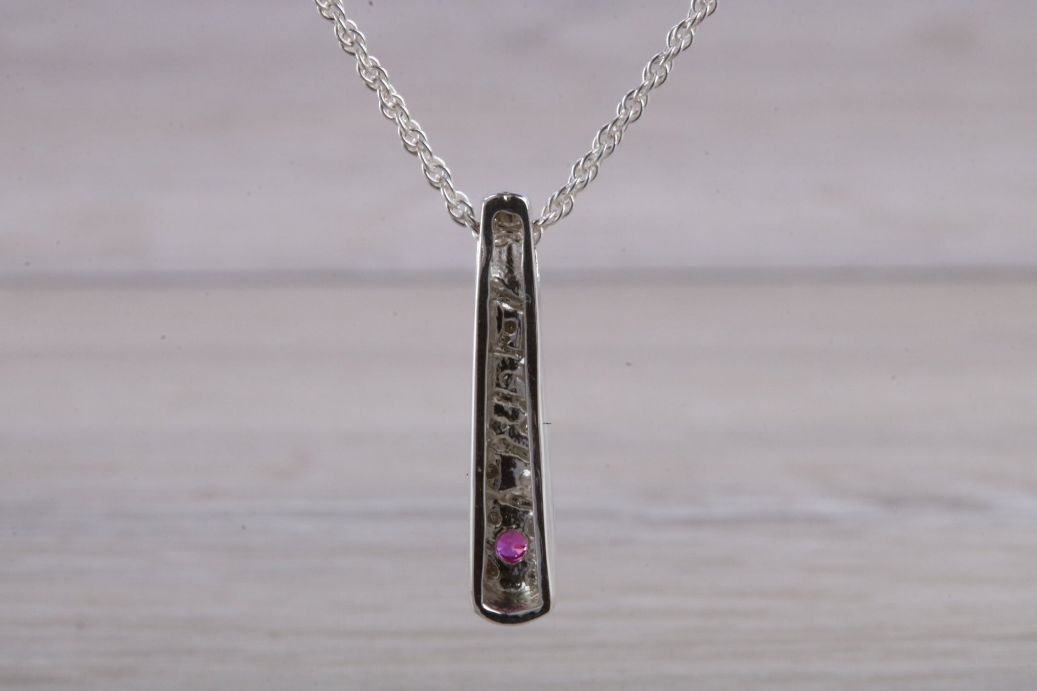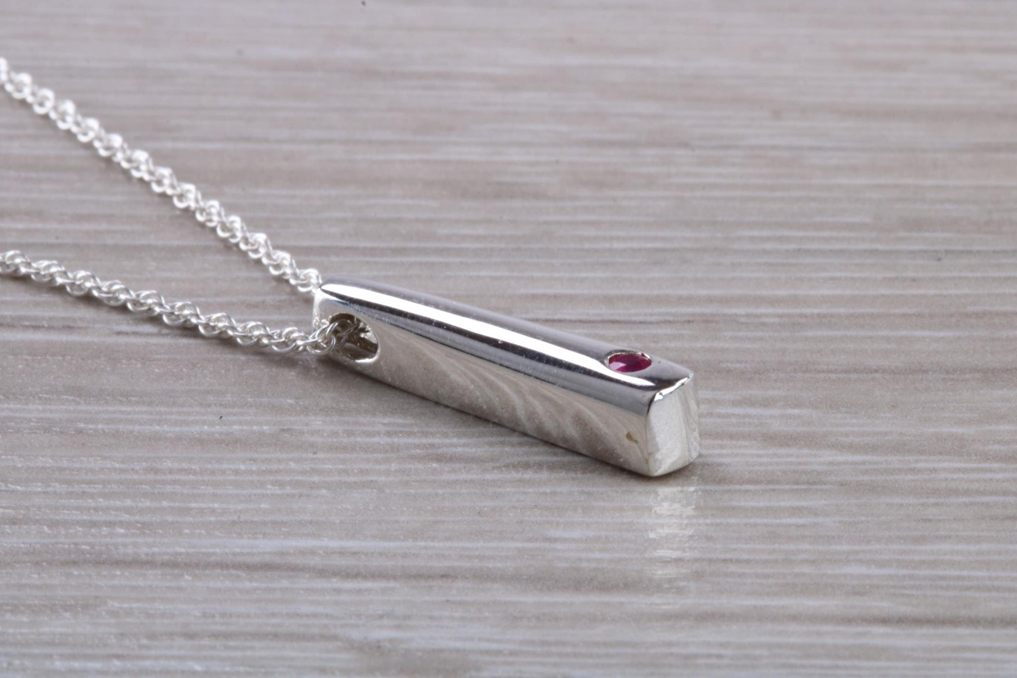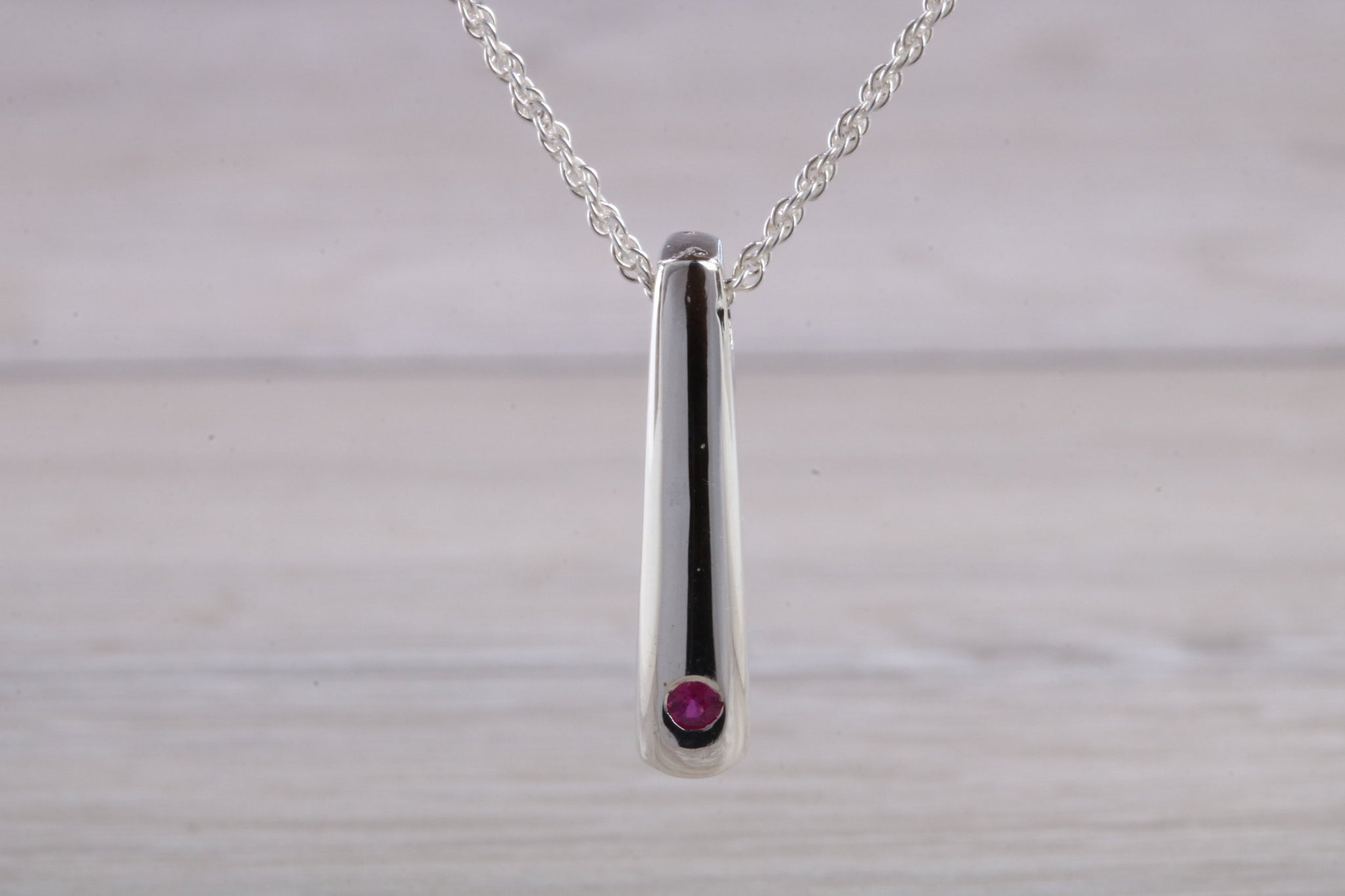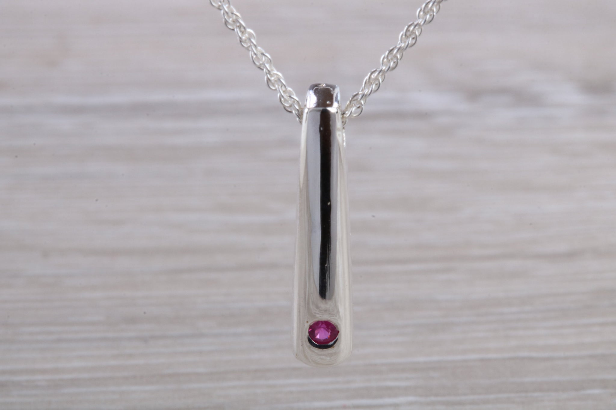 Round brilliant cut Ruby measuring 2.00 mm and set in sterling silver pendant together with 16 inch long sterling silver chain.