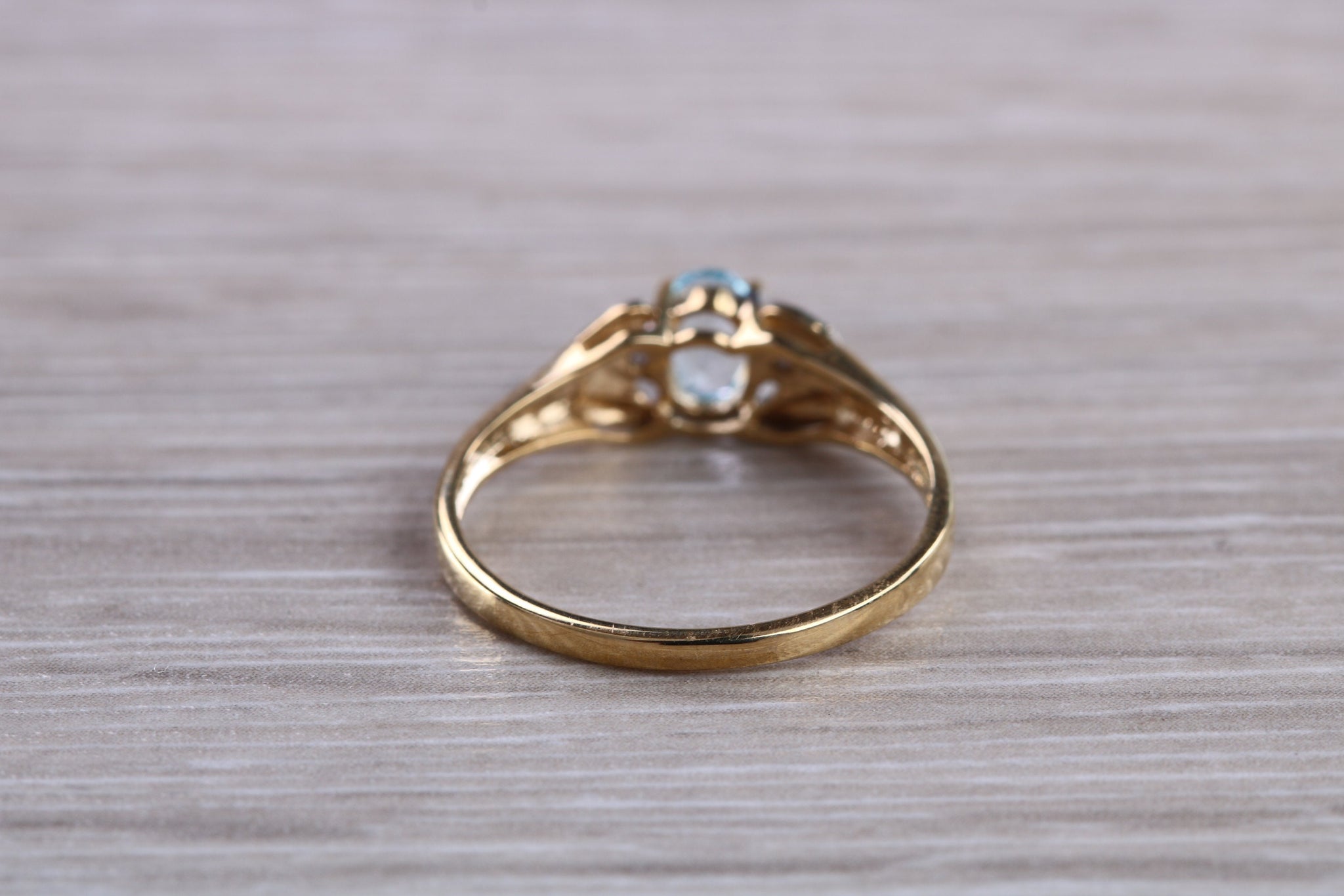 9ct yellow gold ring set with real sky blue topaz and real round diamonds