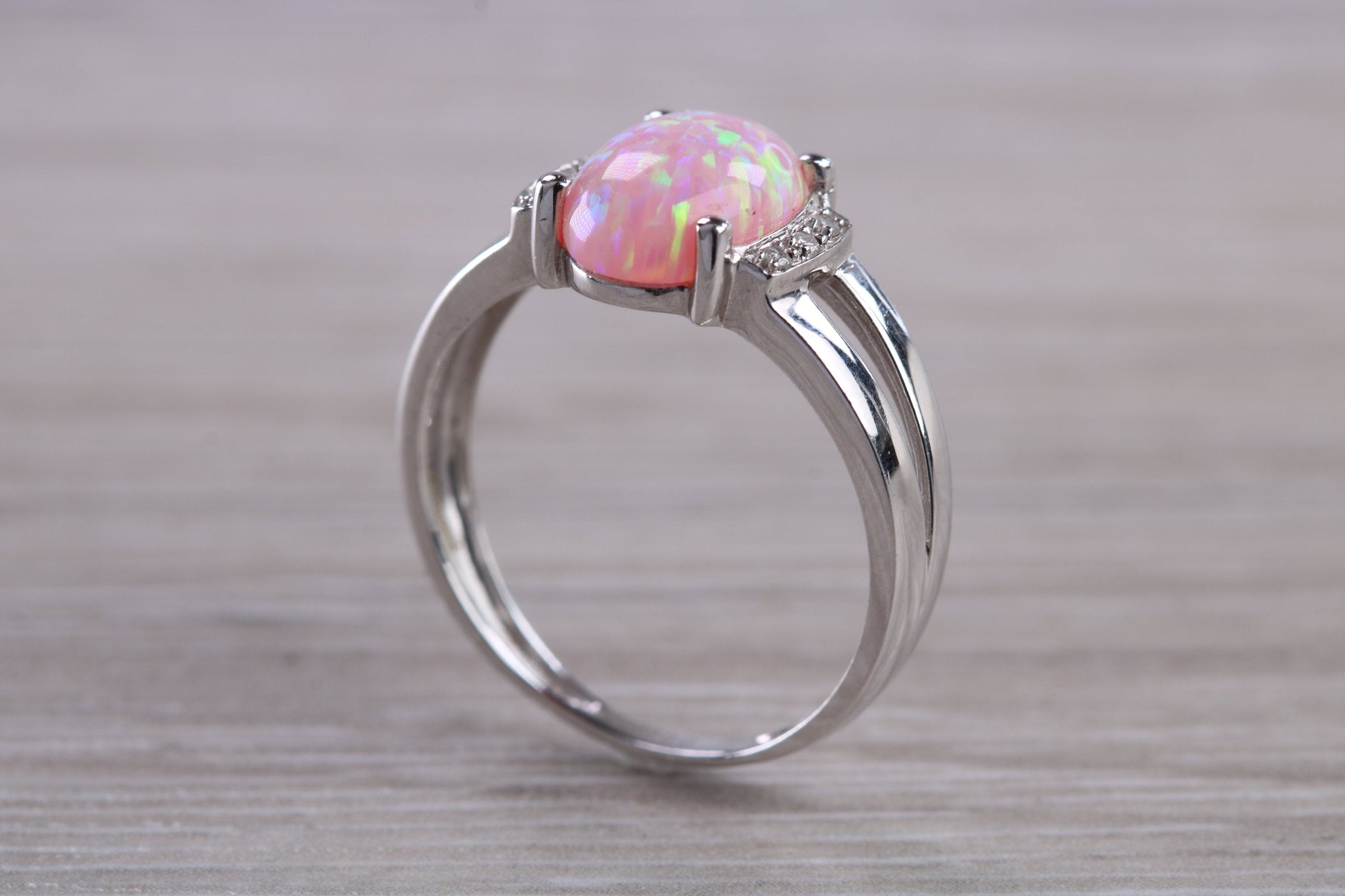Ladies ring set with lab created Opal and surrounded by round Diamonds