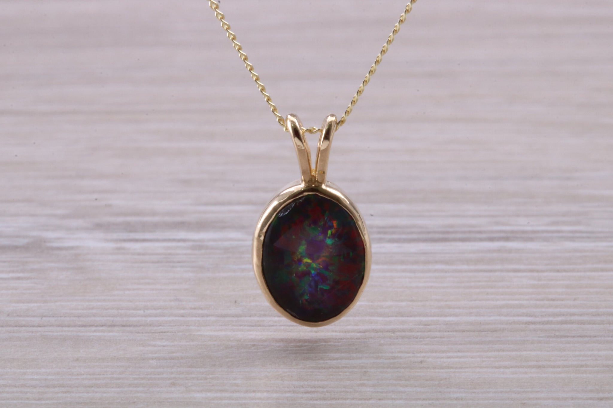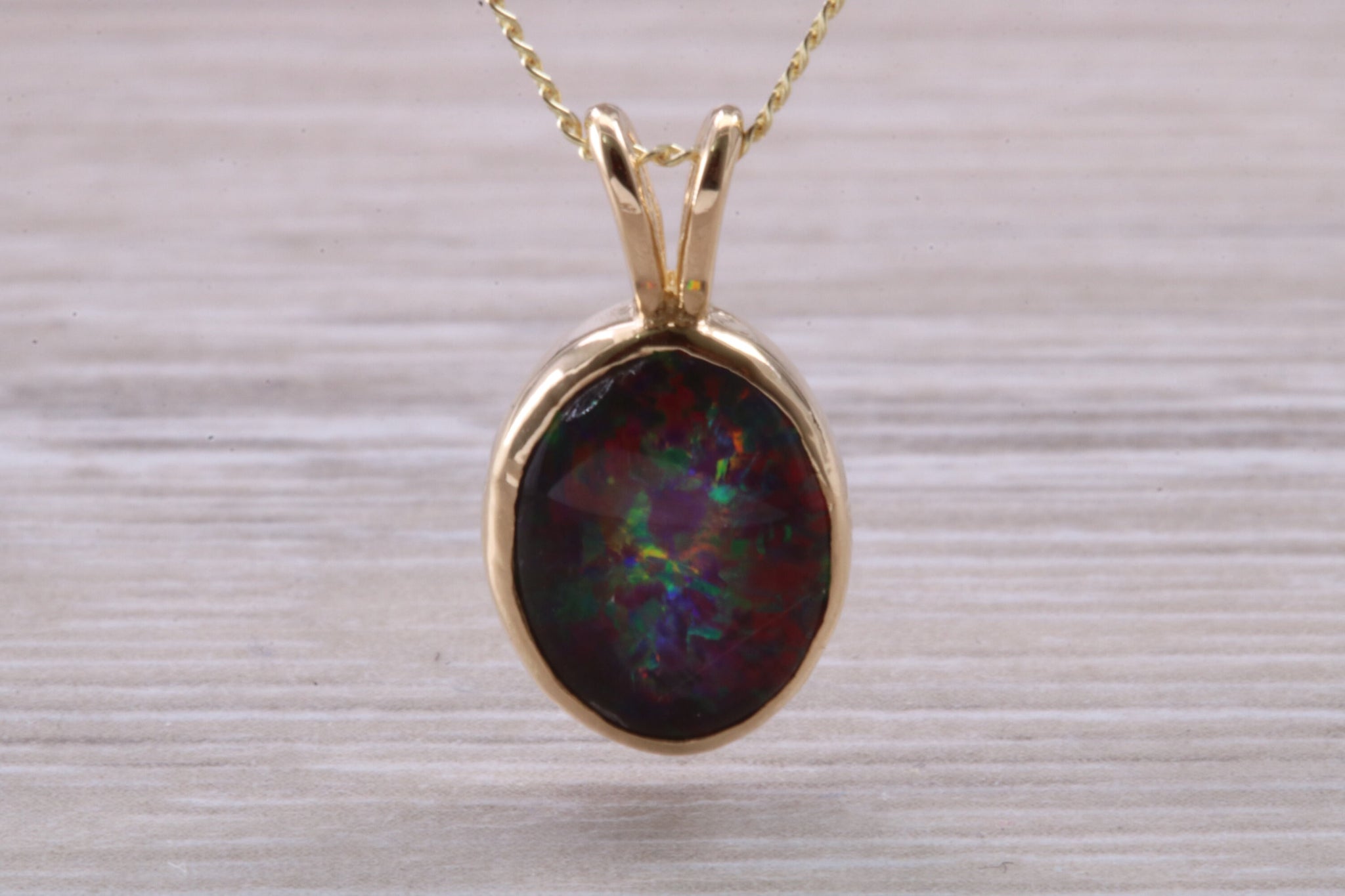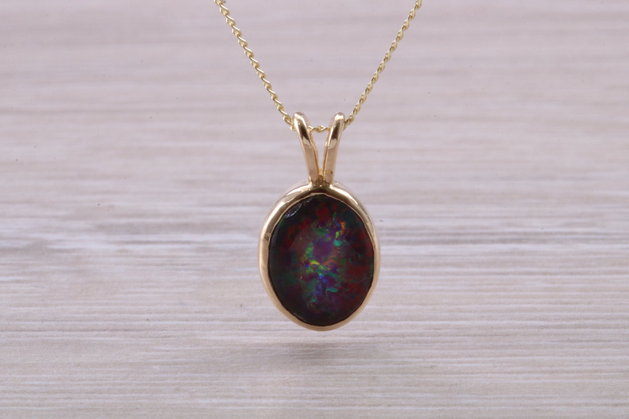 Very fiery with lots of colours in this natural Opal pendant together with chain set in lovely contrasting 9ct yellow gold