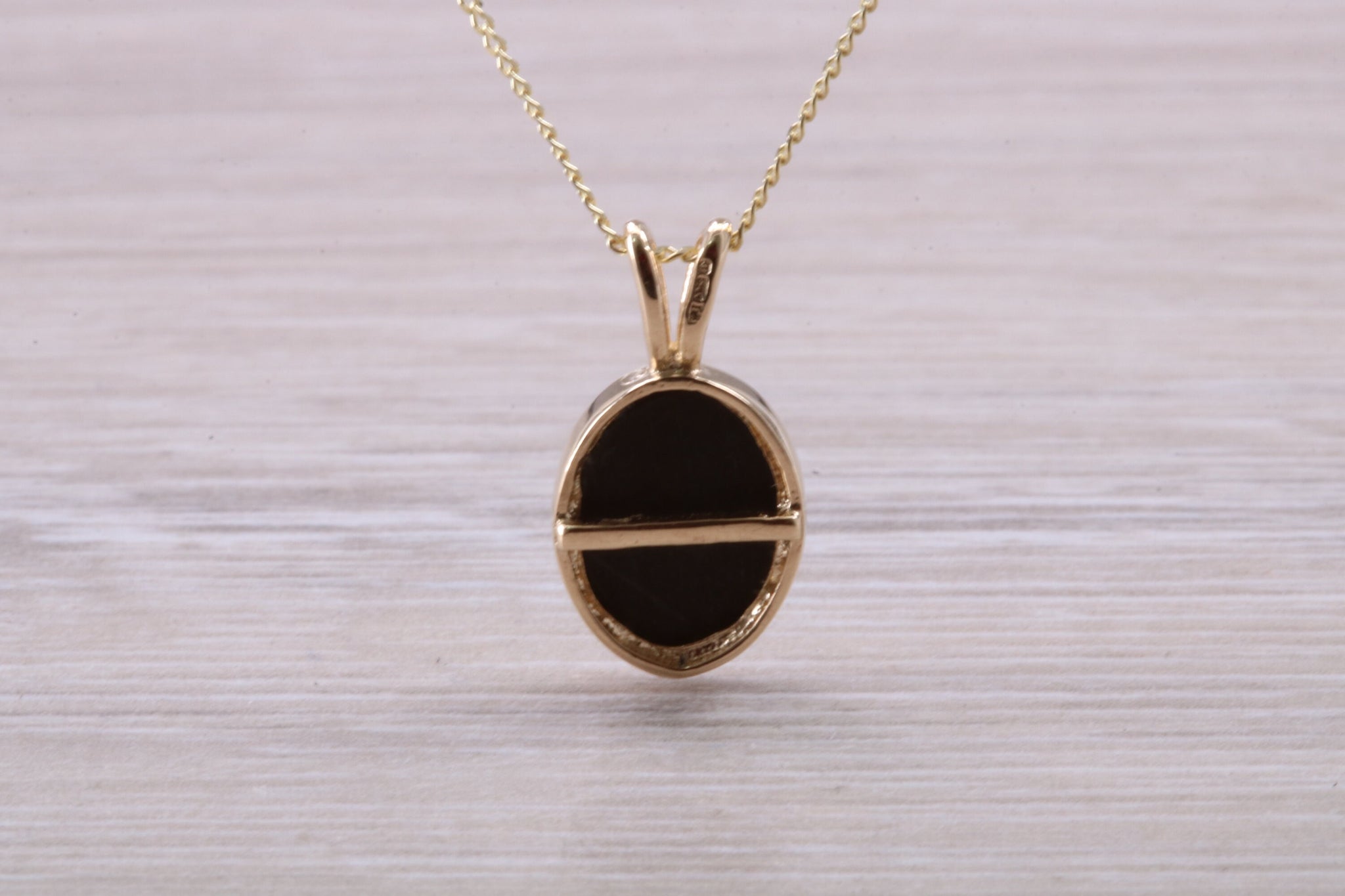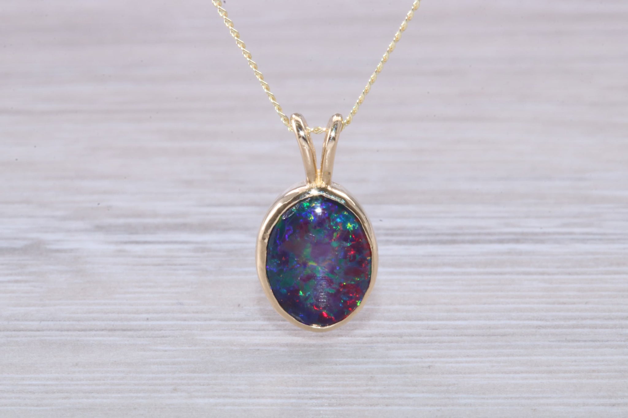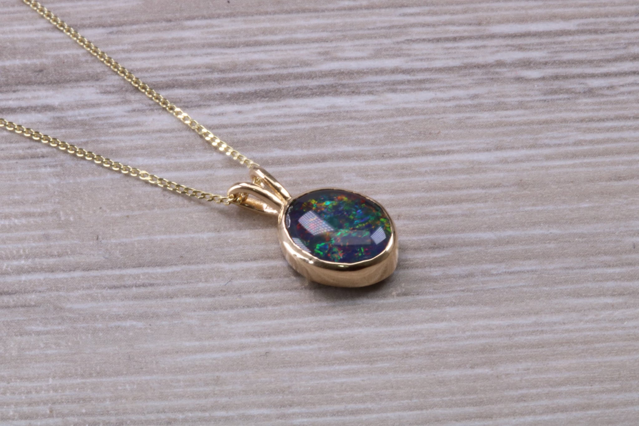 Very fiery with lots of colours in this natural Opal pendant together with chain set in lovely contrasting 9ct yellow gold